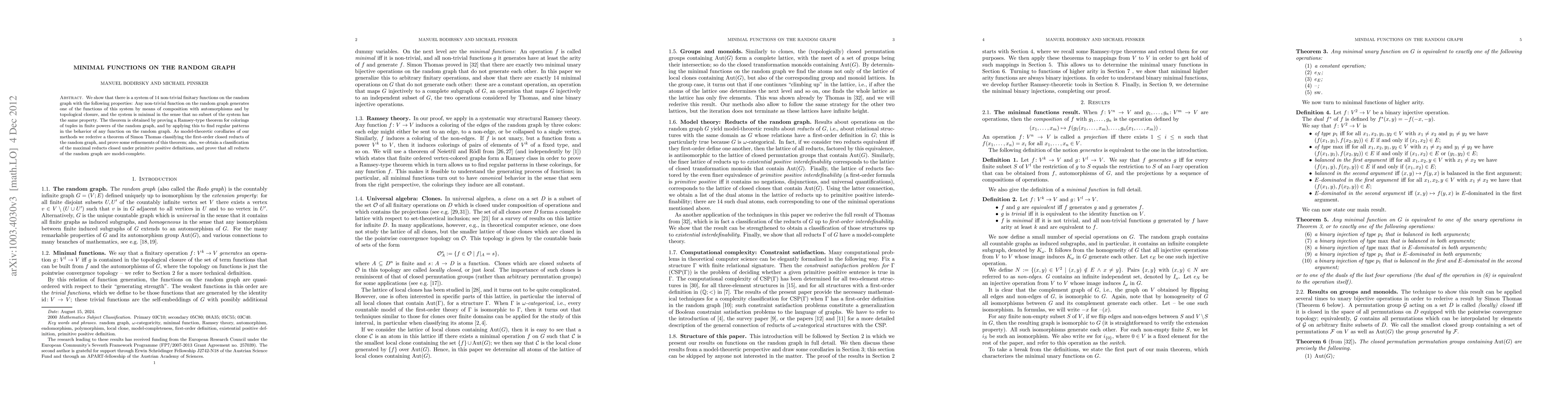 This paper identifies a minimal set of 14 finitary functions on the random graph that encompasses all non-trivial functions through composition and closure, derived via a Ramsey-type theorem. It also provides model-theoretic classifications, including refinements of Simon Thomas's theorem on first-order closed reducts.