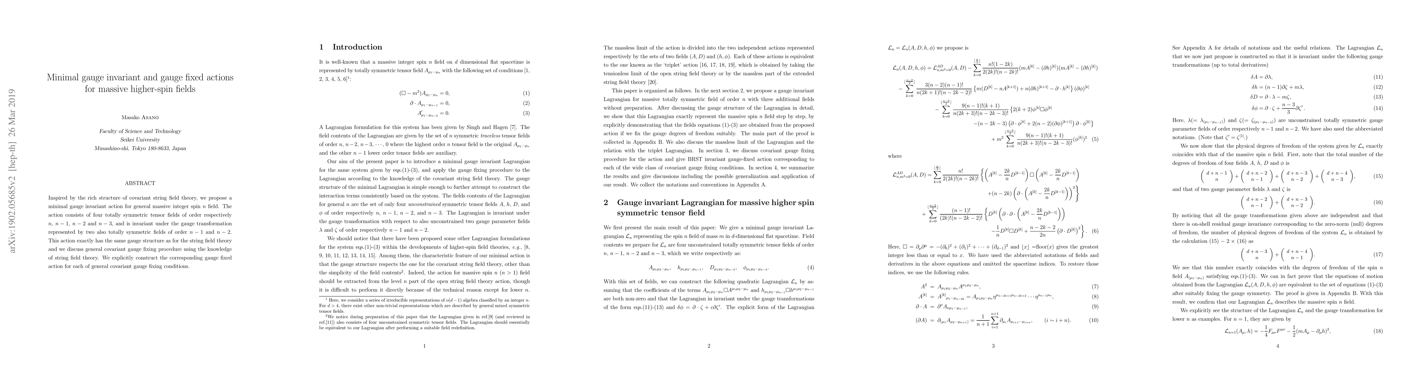 Summary: The paper proposes a minimal gauge invariant action for massive integer spin fields, similar to string field theory, and constructs gauge fixed actions under various covariant gauge fixing conditions inspired by string field theory. The gauge transformations and structure are fully detailed.