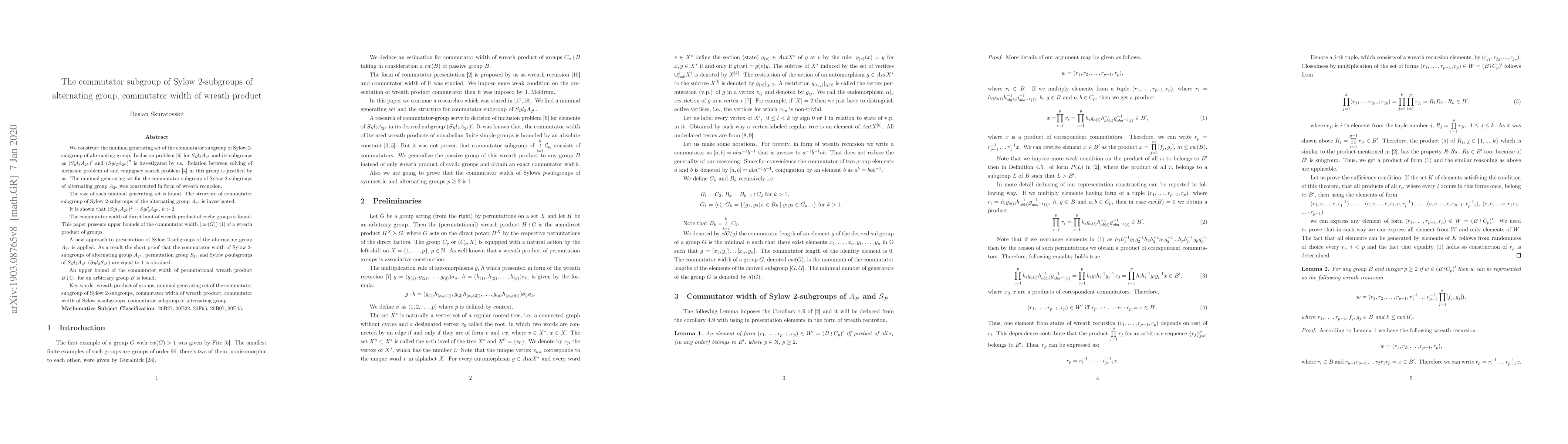This research determines the minimal generating set size for the commutator subgroup of Sylow 2-subgroups in alternating groups and finds that the commutator width of these subgroups is 1. It also proves similar commutator width properties for wreath products of cyclic groups and explores the structure of commutator subgroups in symmetric and alternating groups.