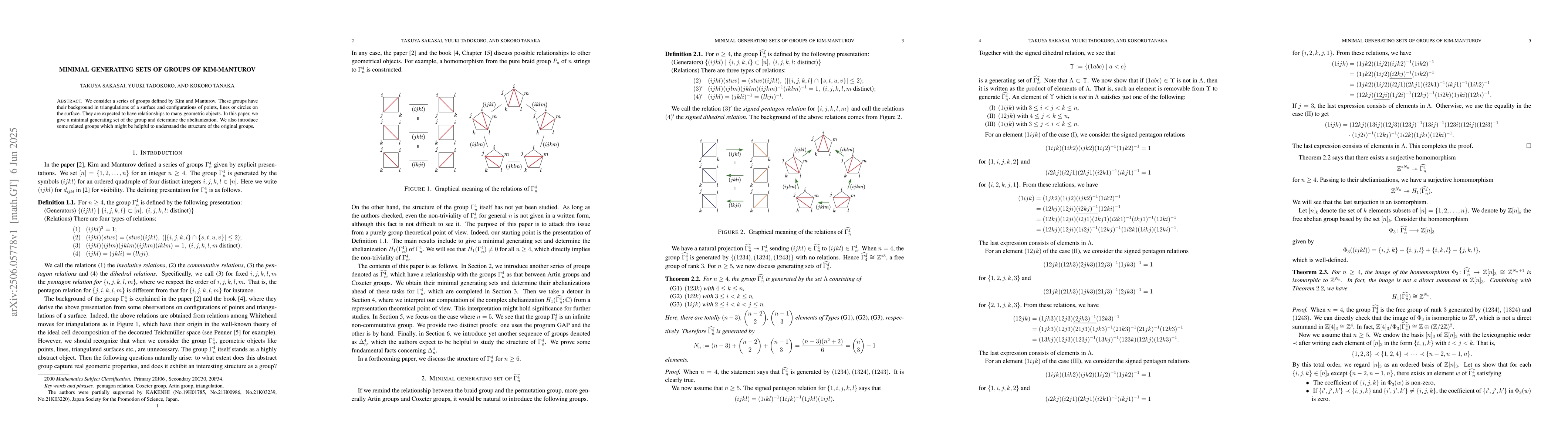 We consider a series of groups defined by Kim and Manturov. These groups have their background in triangulations of a surface and configurations of points, lines or circles on the surface. They are expected to have relationships to many geometric objects. In this paper, we give a minimal generating set of the group and determine the abelianization. We also introduce some related groups which might be helpful to understand the structure of the original groups.