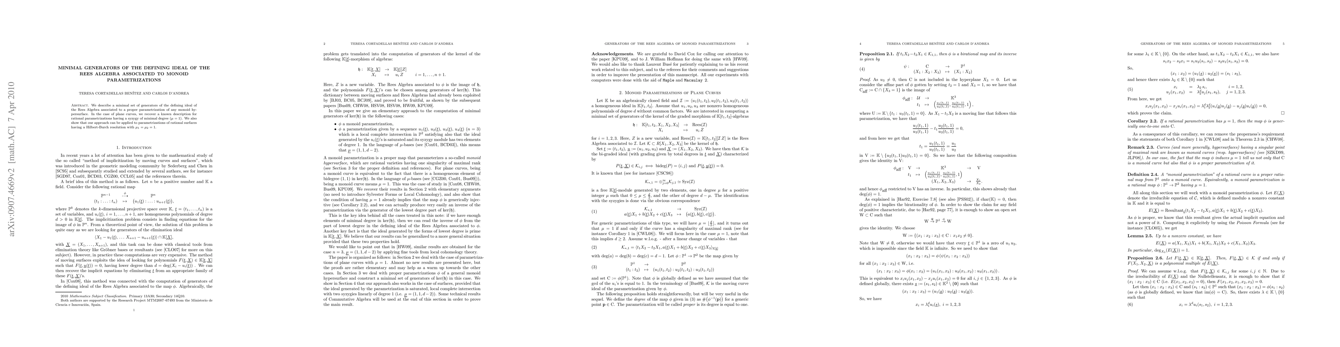 We describe a minimal set of generators of the defining ideal of the Rees Algebra associated to a proper parametrization of any monoid hypersurface. In the case of plane curves, we recover a known description for rational parametrizations having a syzygy of minimal degree (\mu=1). We also show that our approach can be applied to parametrizations of rational surfaces having a Hilbert-Burch resolution with \mu_1=\mu_2=1.