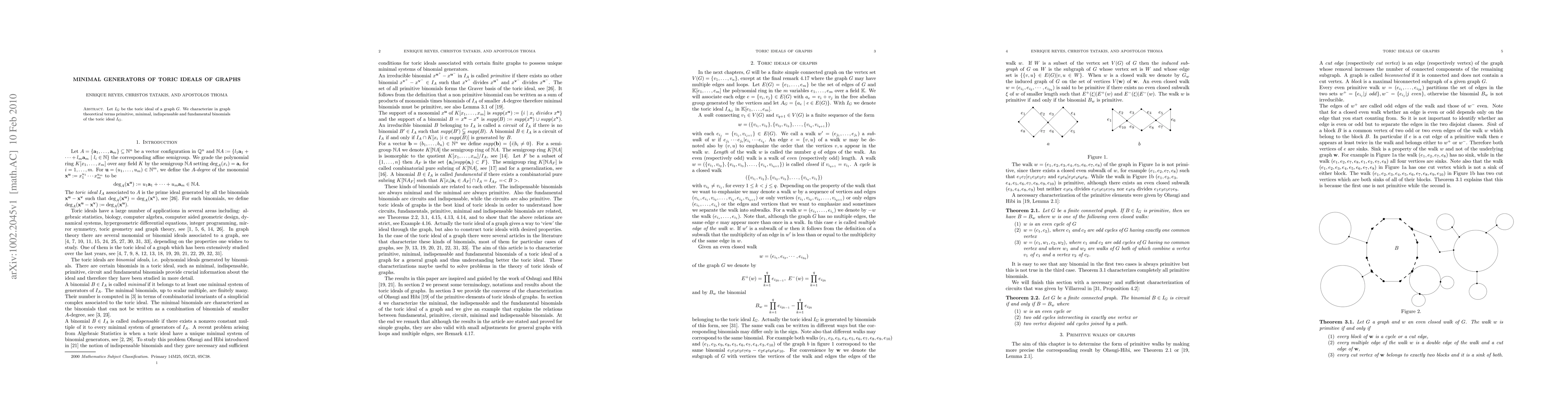 Let $I_G$ be the toric ideal of a graph $G$. We characterize in graph theoretical terms the primitive, the minimal, the indispensable and the fundamental binomials of the toric ideal $I_G$.