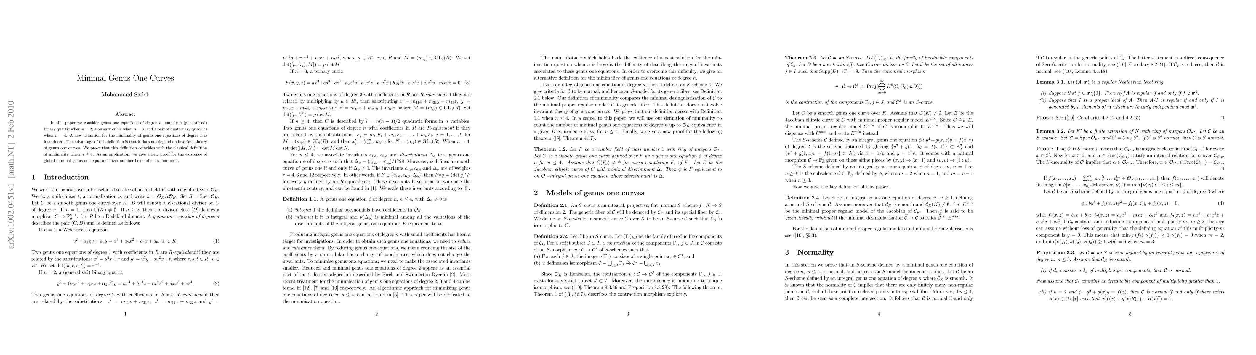 This paper introduces a new definition for the minimality of genus one curves of degree n, which does not rely on invariant theory. It demonstrates that this definition aligns with classical minimality for n ≤ 4 and provides a new proof for the existence of minimal genus one curves over number fields with class number 1.
