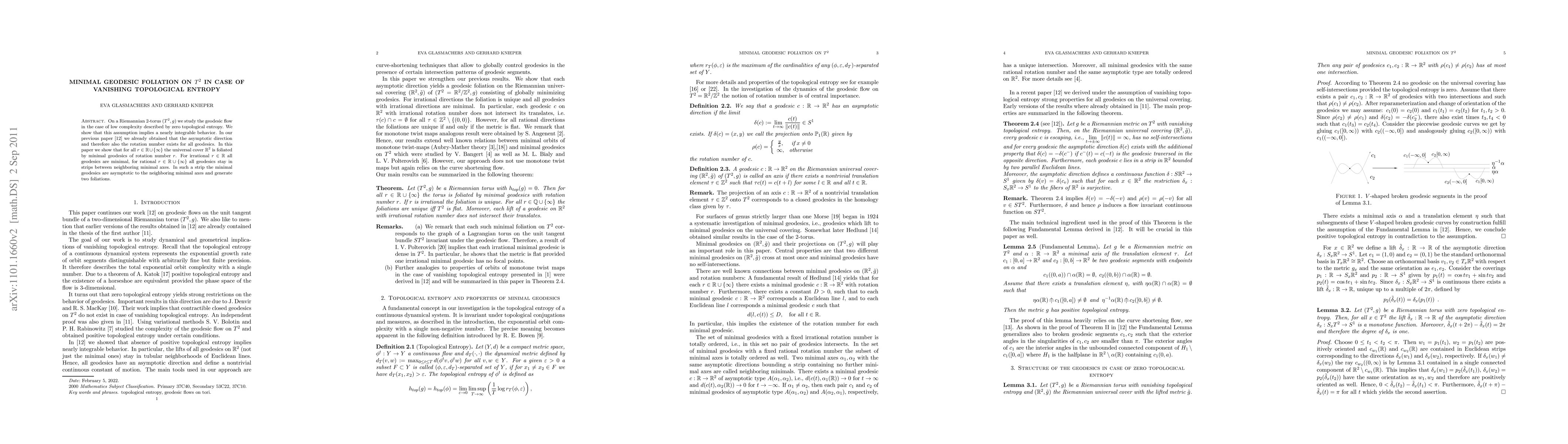 On a Riemannian 2-torus $(T^2,g)$ we study the geodesic flow in the case of low complexity described by zero topological entropy. We show that this assumption implies a nearly integrable behavior. In our previous paper \cite{GK} we already obtained that the asymptotic direction and therefore also the rotation number exists for all geodesics. In this paper we show that for all $r \in \mathbb{R} \cup \{\infty\}$ the universal cover $\Br^2$ is foliated by minimal geodesics of rotation number $r$. For irrational $r \in \mathbb{R}$ all geodesics are minimal, for rational $r \in \mathbb{R} \cup \{\infty\}$ all geodesics stay in strips between neighboring minimal axes. In such a strip the minimal geodesics are asymptotic to the neighboring minimal axes and generate two foliations.