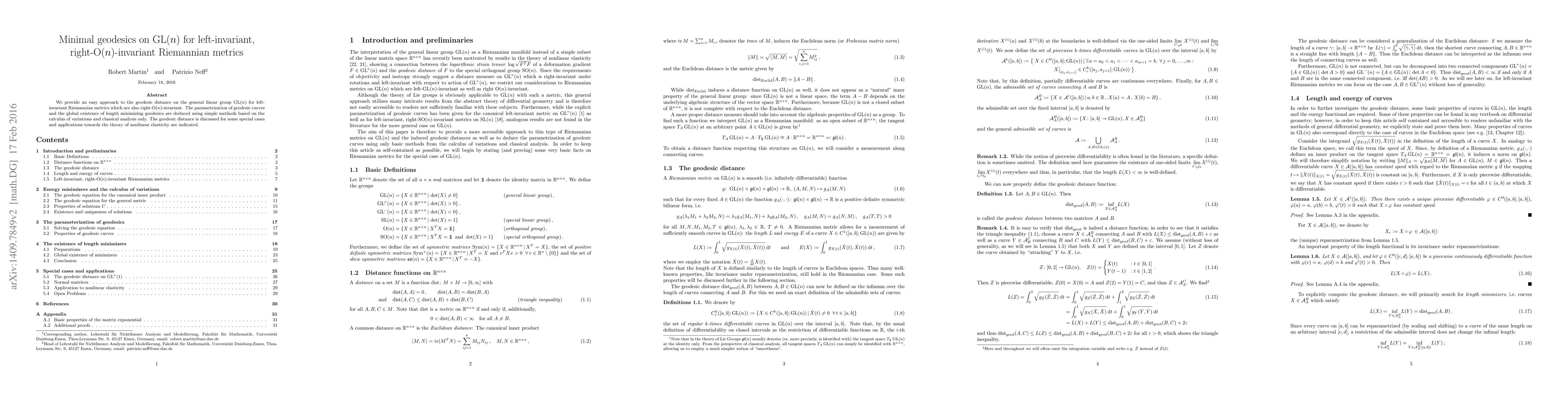 This paper presents an accessible method for determining geodesic distances on GL(n) for left-invariant, right-O(n)-invariant Riemannian metrics, utilizing calculus of variations and classical analysis. It also explores the implications for nonlinear elasticity.