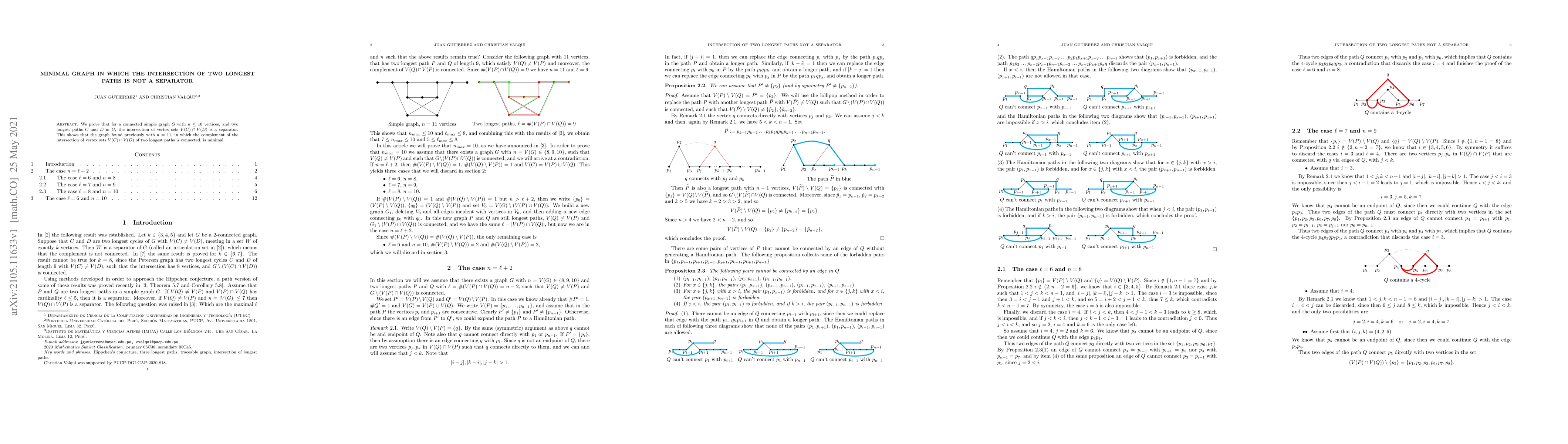 We prove that for a connected simple graph $G$ with $n\le 10$ vertices, and two longest paths $C$ and $D$ in $G$, the intersection of vertex sets $V(C)\cap V(D)$ is a separator. This shows that the graph found previously with $n=11$, in which the complement of the intersection of vertex sets $V(C)\cap V(D)$ of two longest paths is connected, is minimal.
