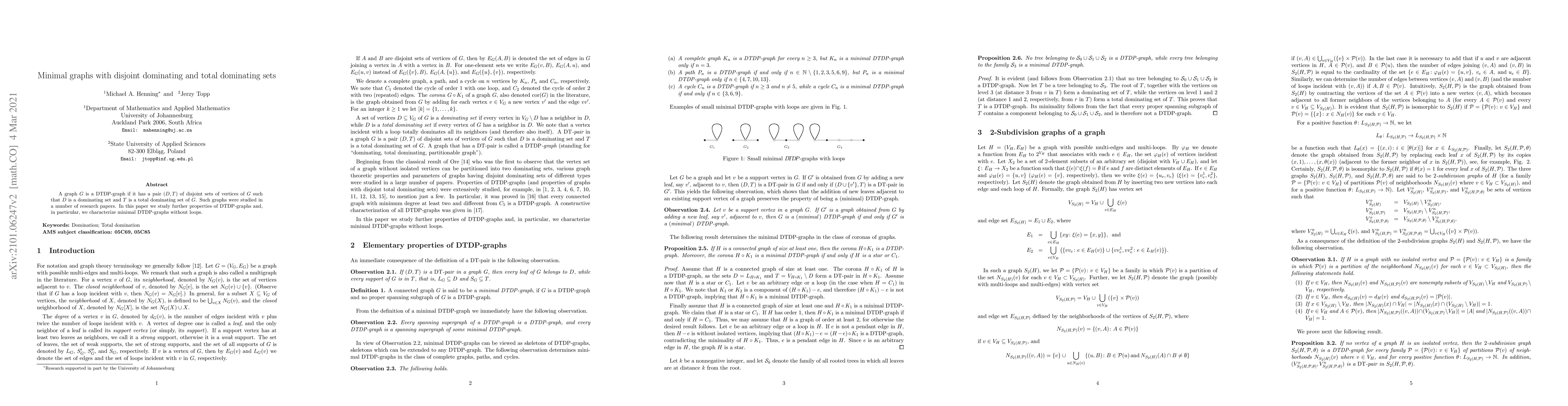 This paper investigates DTDP-graphs, which possess disjoint dominating and total dominating sets, and characterizes minimal DTDP-graphs without loops, exploring their properties in greater detail.