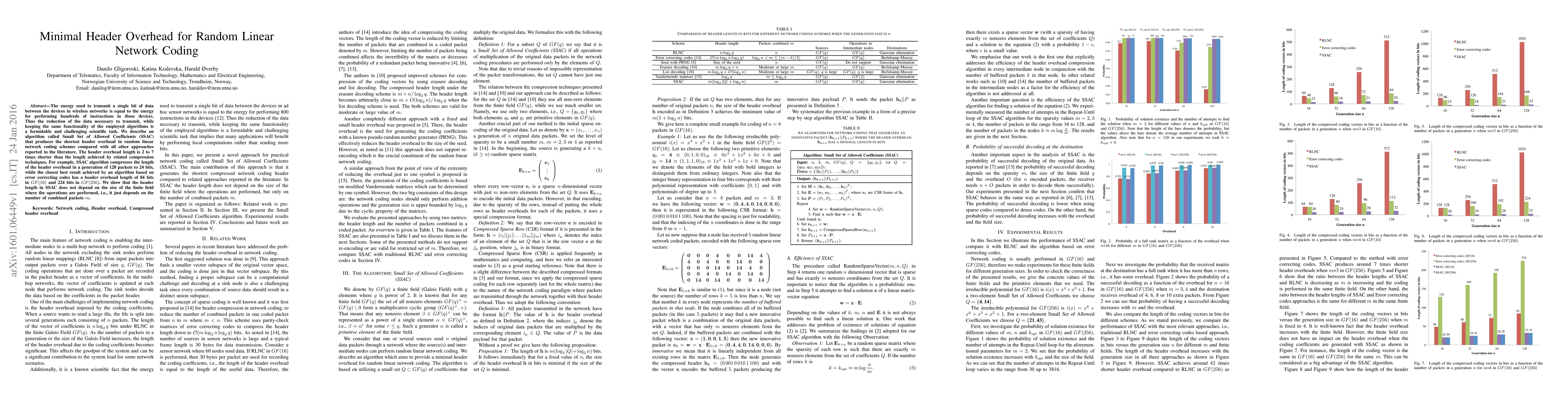 The energy used to transmit a single bit of data between the devices in wireless networks is equal to the energy for performing hundreds of instructions in those devices. Thus the reduction of the data necessary to transmit, while keeping the same functionality of the employed algorithms is a formidable and challenging scientific task. We describe an algorithm called Small Set of Allowed Coefficients (SSAC) that produces the shortest header overhead in random linear network coding schemes compared with all other approaches reported in the literature. The header overhead length is 2 to 7 times shorter than the length achieved by related compression techniques. For example, SSAC algorithm compresses the length of the header overhead in a generation of 128 packets to 24 bits, while the closest best result achieved by an algorithm based on error correcting codes has a header overhead length of 84 bits in $GF(16)$ and 224 bits in $GF(256)$. We show that the header length in SSAC does not depend on the size of the finite field where the operations are performed, i.e., it just depends on the number of combined packets $m$.