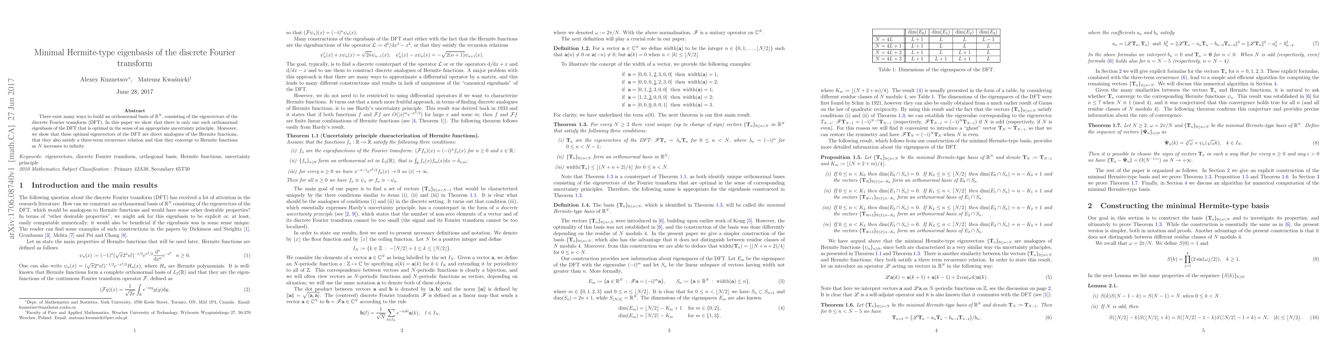 This paper demonstrates that there is a unique orthonormal eigenbasis of the discrete Fourier transform (DFT) that optimally satisfies an uncertainty principle, analogous to Hermite functions, and converges to them as the dimension $N$ tends to infinity. The basis also adheres to a three-term recurrence relation.
