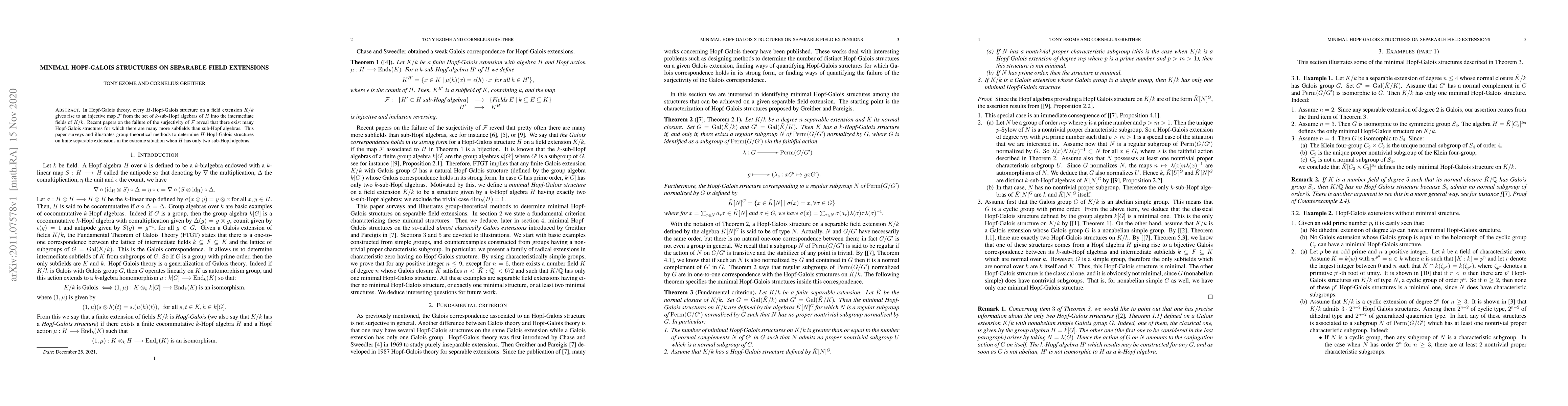 This paper explores minimal Hopf-Galois structures on separable field extensions, focusing on cases where the Hopf algebra $H$ possesses only two sub-Hopf algebras. It utilizes group-theoretical methods to determine such structures, addressing situations where the number of sub-Hopf algebras significantly outnumbers intermediate fields.