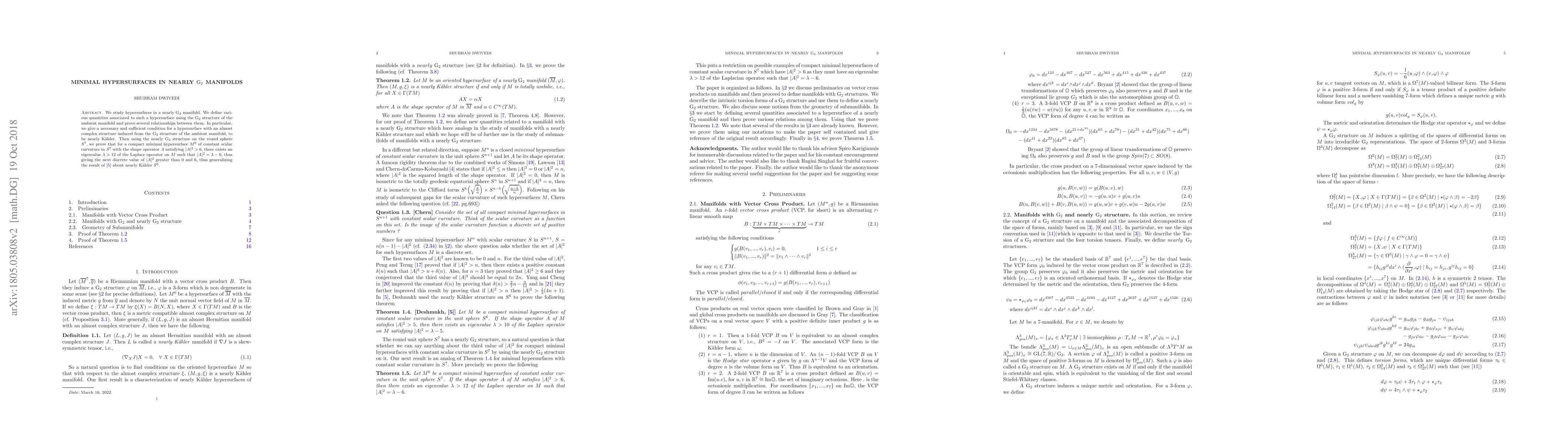 We study hypersurfaces in a nearly $\mathrm{G}_2$ manifold. We define various quantities associated to such a hypersurface using the $\mathrm{G}_2$ structure of the ambient manifold and prove several relationships between them. In particular, we give a necessary and sufficient condition for a hypersurface with an almost complex structure induced from the $\mathrm{G}_2$ structure of the ambient manifold, to be nearly K$\ddot{\text{a}}$hler. Then using the nearly $\mathrm{G}_2$ structure on the round sphere $S^7$, we prove that for a compact minimal hypersurface $M^6$ of constant scalar curvature in $S^7$ with the shape operator $A$ satisfying $|A|^2>6$, there exists an eigenvalue $\lambda >12$ of the Laplace operator on $M$ such that $|A|^2=\lambda - 6$, thus giving the next discrete value of $|A|^2$ greater than $0$ and $6$, thus generalizing an earlier result about nearly K$\ddot{\text{a}}$hler $S^6$.