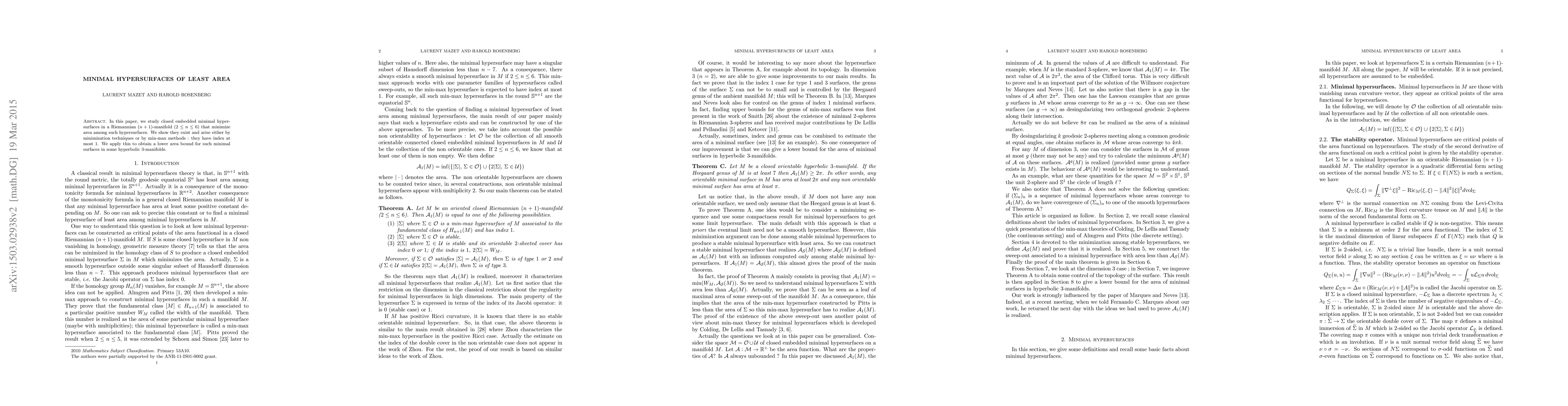 In this paper, we study closed embedded minimal hypersurfaces in a Riemannian $(n+1)$-manifold ($2\le n\le 6$) that minimize area among such hypersurfaces. We show they exist and arise either by minimization techniques or by min-max methods: they have index at most $1$. We apply this to obtain a lower area bound for such minimal surfaces in some hyperbolic $3$-manifolds.