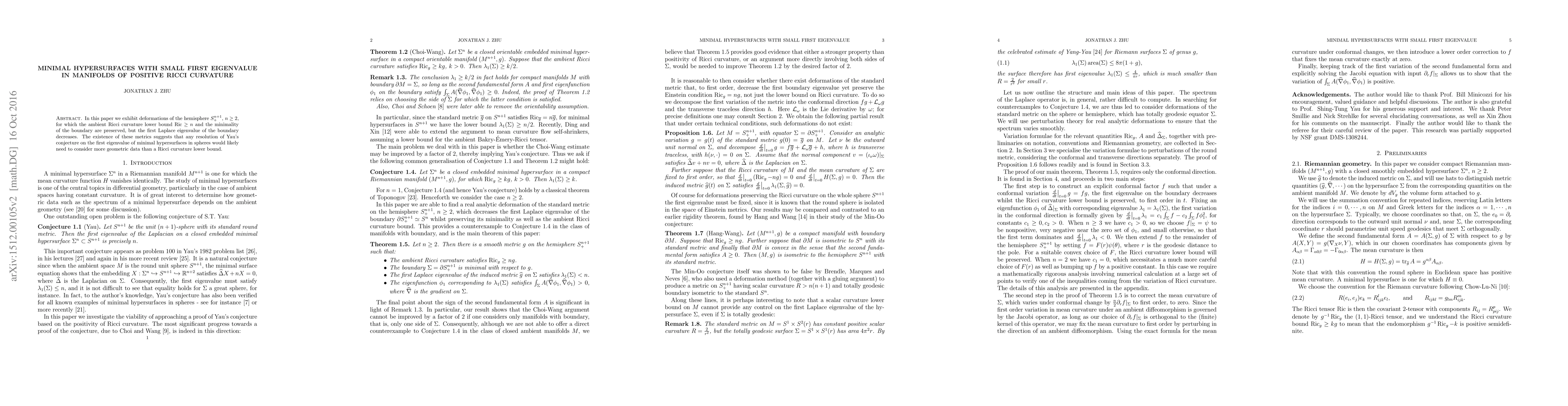 In this paper we exhibit deformations of the hemisphere $S^{n+1}_+$, $n\geq 2$, for which the ambient Ricci curvature lower bound $\text{Ric}\geq n $ and the minimality of the boundary are preserved, but the first Laplace eigenvalue of the boundary decreases. The existence of these metrics suggests that any resolution of Yau's conjecture on the first eigenvalue of minimal hypersurfaces in spheres would likely need to consider more geometric data than a Ricci curvature lower bound.