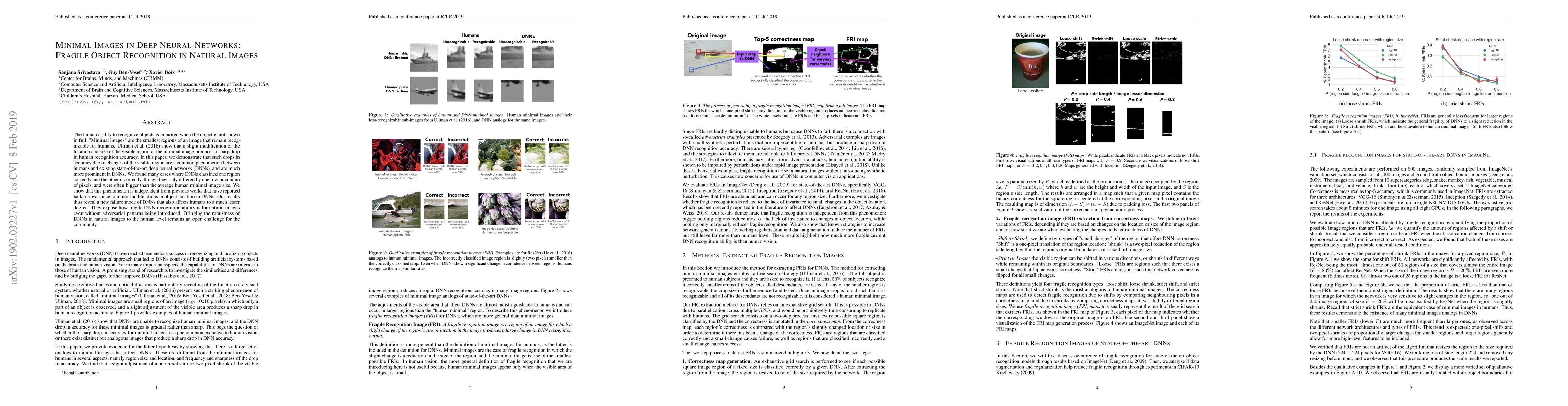 The human ability to recognize objects is impaired when the object is not shown in full. "Minimal images" are the smallest regions of an image that remain recognizable for humans. Ullman et al. 2016 show that a slight modification of the location and size of the visible region of the minimal image produces a sharp drop in human recognition accuracy. In this paper, we demonstrate that such drops in accuracy due to changes of the visible region are a common phenomenon between humans and existing state-of-the-art deep neural networks (DNNs), and are much more prominent in DNNs. We found many cases where DNNs classified one region correctly and the other incorrectly, though they only differed by one row or column of pixels, and were often bigger than the average human minimal image size. We show that this phenomenon is independent from previous works that have reported lack of invariance to minor modifications in object location in DNNs. Our results thus reveal a new failure mode of DNNs that also affects humans to a much lesser degree. They expose how fragile DNN recognition ability is for natural images even without adversarial patterns being introduced. Bringing the robustness of DNNs in natural images to the human level remains an open challenge for the community.