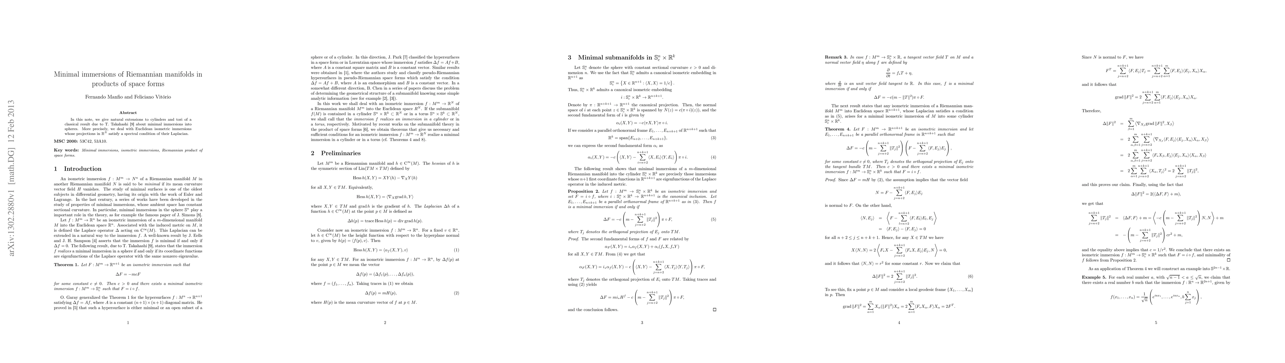 Summary: This paper extends Takahashi's classical result on minimal immersions into spheres to cylinders and tori, focusing on Euclidean isometric immersions satisfying a specific spectral condition of their Laplacian. The study provides natural extensions of minimal immersions in products of space forms.