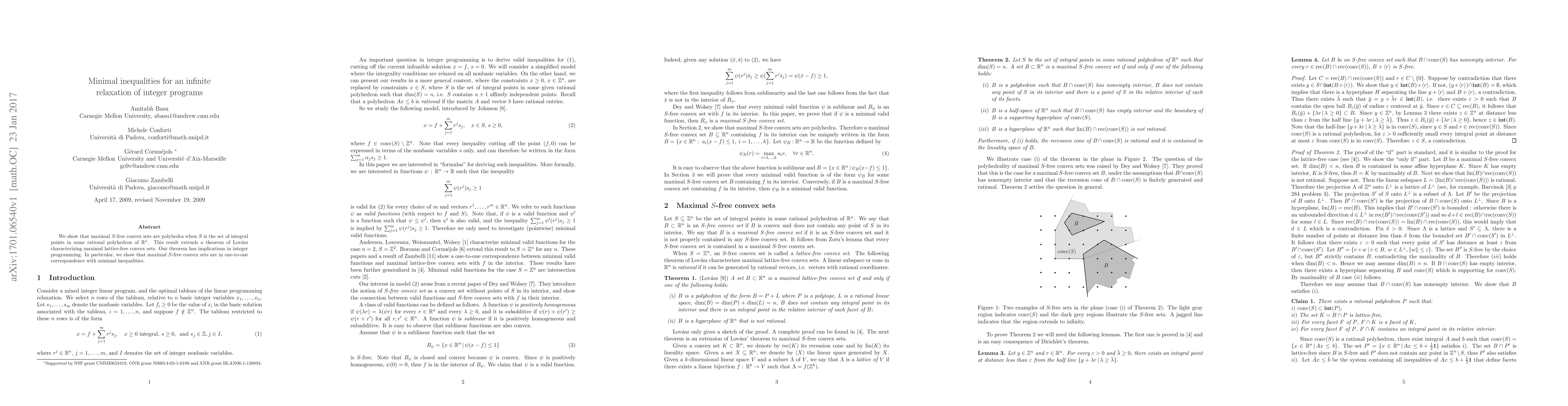 We show that maximal $S$-free convex sets are polyhedra when $S$ is the set of integral points in some rational polyhedron of $\mathbb{R}^n$. This result extends a theorem of Lov\'asz characterizing maximal lattice-free convex sets. Our theorem has implications in integer programming. In particular, we show that maximal $S$-free convex sets are in one-to-one correspondence with minimal inequalities.
