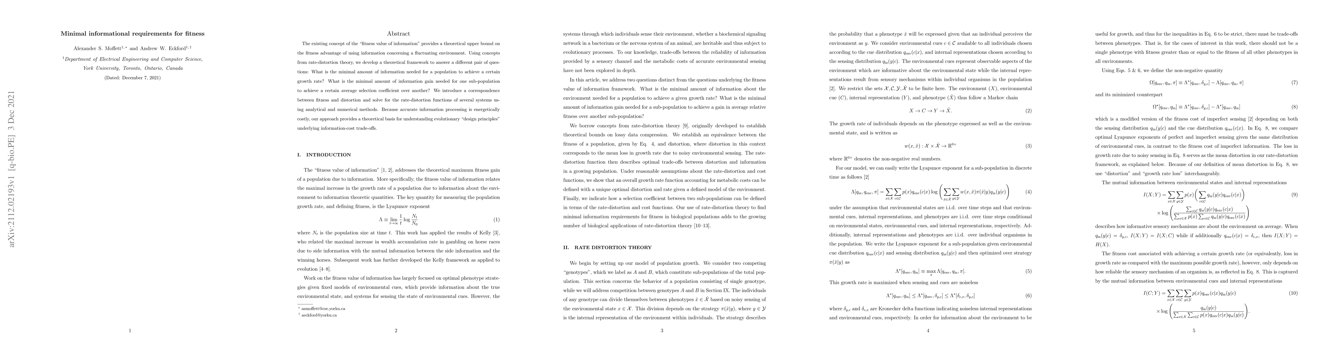 The existing concept of the "fitness value of information" provides a theoretical upper bound on the fitness advantage of using information concerning a fluctuating environment. Using concepts from rate-distortion theory, we develop a theoretical framework to answer a different pair of questions: What is the minimal amount of information needed for a population to achieve a certain growth rate? What is the minimal amount of information gain needed for one sub-population to achieve a certain average selection coefficient over another? We introduce a correspondence between fitness and distortion and solve for the rate-distortion functions of several systems using analytical and numerical methods. Because accurate information processing is energetically costly, our approach provides a theoretical basis for understanding evolutionary "design principles" underlying information-cost trade-offs.