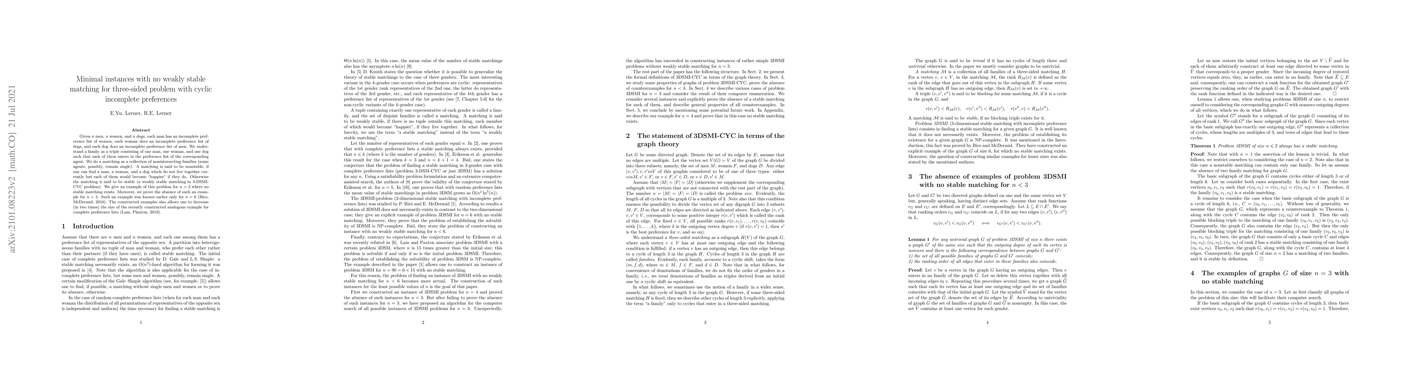 Researchers prove that for 3-sided problems with cyclic incomplete preferences, no stable matching exists for n < 3, while examples exist for n = 3.