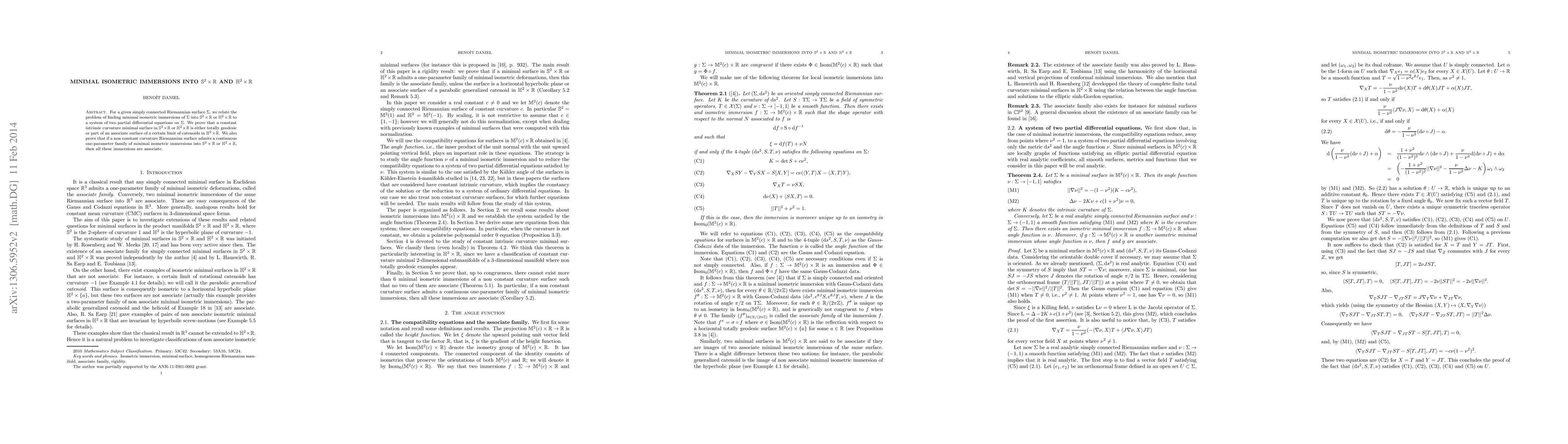 This paper explores minimal isometric immersions of simply connected Riemannian surfaces into hyperbolic and spherical cylinder spaces, deriving a system of PDEs and proving that such surfaces are either totally geodesic or associate to certain catenoid limits, with continuous families of immersions being associate.