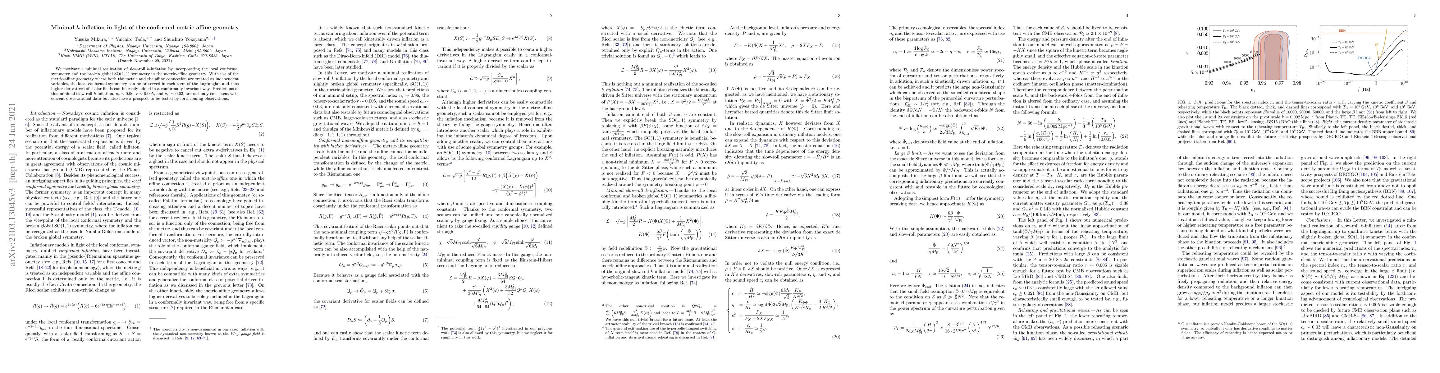 This paper proposes a minimal $k$-inflation model using metric-affine geometry that incorporates local conformal symmetry and broken global $\mathrm{SO}(1,1)$ symmetry. The model's predictions, including $n_\mathrm{s}\sim 0.96$, $r\sim 0.005$, and $c_\mathrm{s}\sim 0.03$, align with current observations and hold promise for future tests.