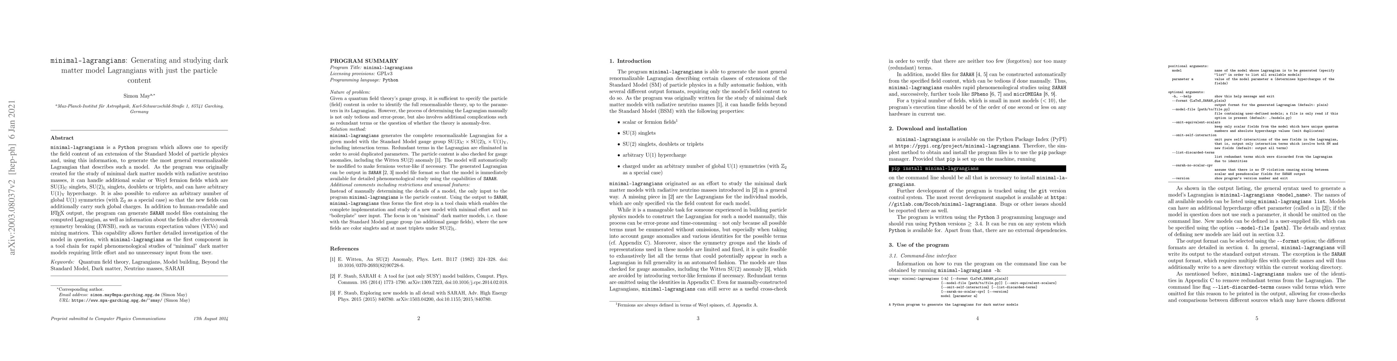 A Python program called minimal-lagrangians generates the most general renormalizable Lagrangian for minimal dark matter models with radiative neutrino masses, allowing for flexible particle content and global symmetries.