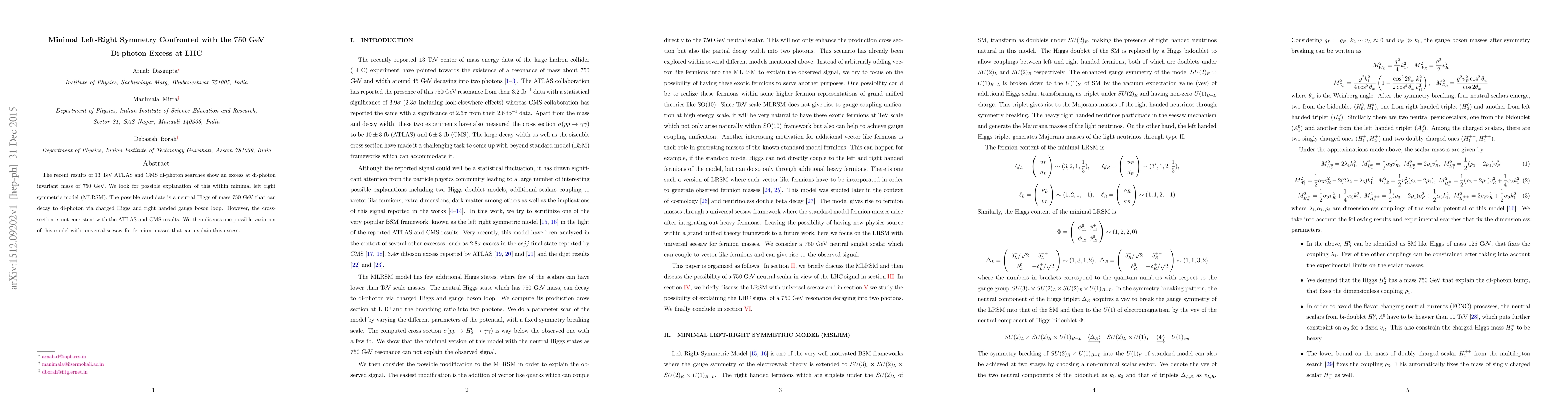 This paper explores the minimal left-right symmetric model (MLRSM) to explain the observed 750 GeV di-photon excess at the LHC, proposing a 750 GeV neutral Higgs as a potential candidate. However, the model's predicted cross-section does not match experimental results, leading to a discussion of a modified version with universal seesaw for fermion masses that could resolve this inconsistency.