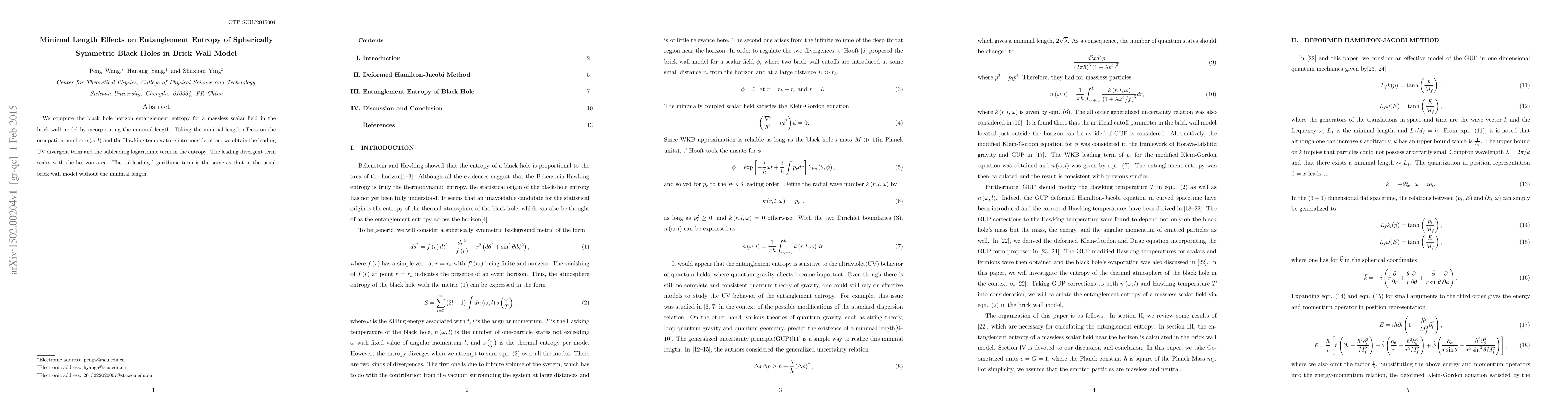 This study calculates the entanglement entropy of spherically symmetric black holes in the brick wall model, incorporating minimal length effects, which reveals a leading UV divergent term scaling with horizon area.