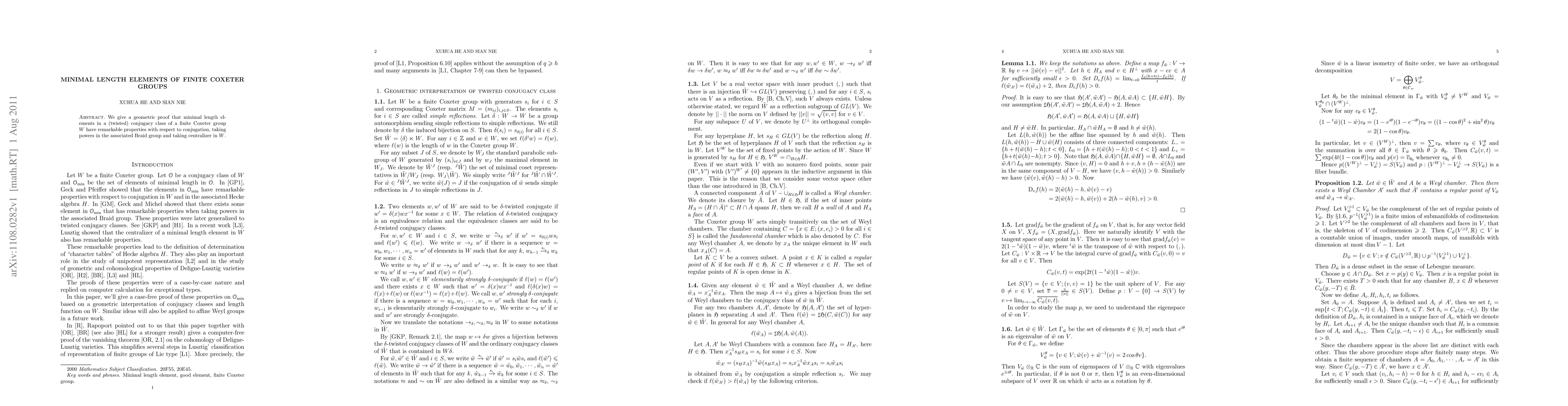 Summary: This paper provides a geometric proof demonstrating unique properties of minimal length elements within twisted conjugacy classes of finite Coxeter groups, particularly regarding their conjugation, powers in the Braid group, and centralizers.