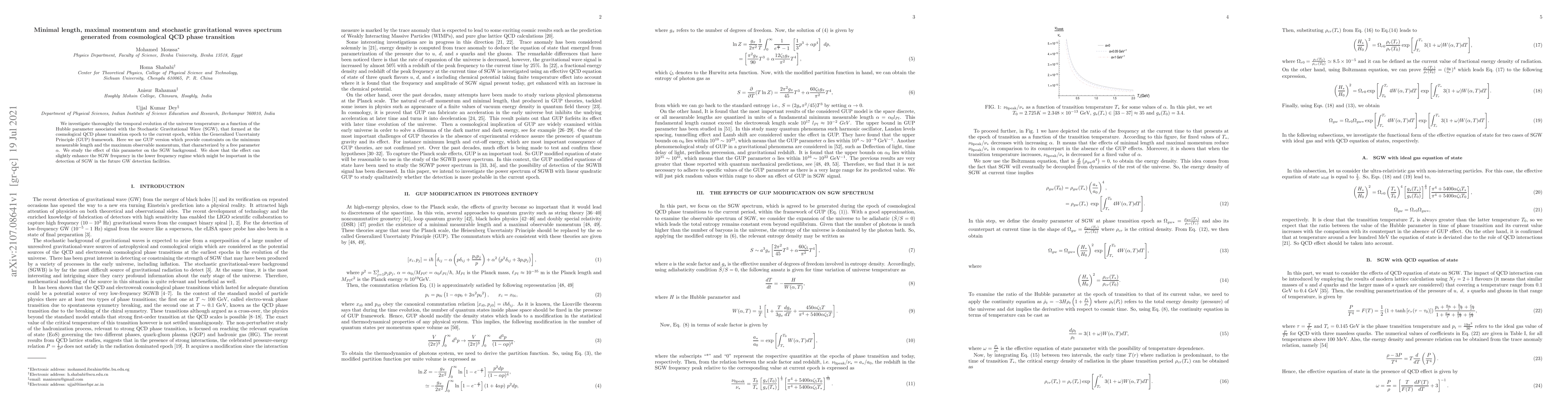 We investigate thoroughly the temporal evolution of the universe temperature as a function of the Hubble parameter associated with the Stochastic Gravitational Wave (SGW), that formed at the cosmological QCD phase transition epoch to the current epoch, within the Generalized Uncertainty Principle (GUP) framework. Here we use GUP version which provide constraints on the minimum measurable length and the maximum observable momentum, that characterized by a free parameter $\alpha$. We study the effect of this parameter on the SGW background. We show that the effect can slightly enhance the SGW frequency in the lower frequency regime which might be important in the detection of SGW in the future GW detection facilities.