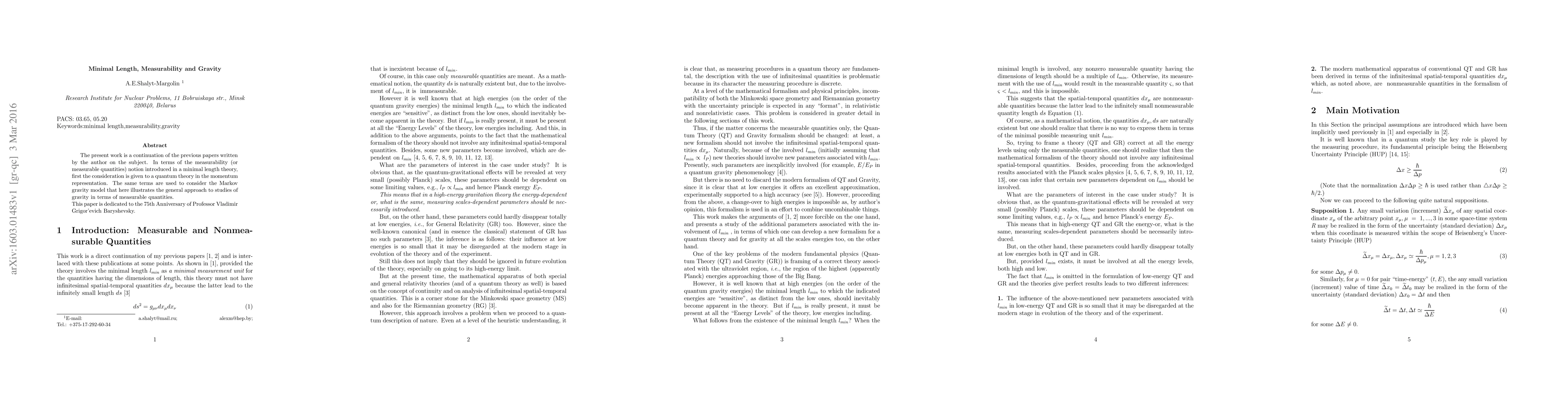 The present work is a continuation of the previous papers written by the author on the subject. In terms of the measurability (or measurable quantities) notion introduced in a minimal length theory, first the consideration is given to a quantum theory in the momentum representation. The same terms are used to consider the Markov gravity model that here illustrates the general approach to studies of gravity in terms of measurable quantities. This paper is dedicated to the 75th Anniversary of Professor Vladimir Grigor'evich Baryshevsky.