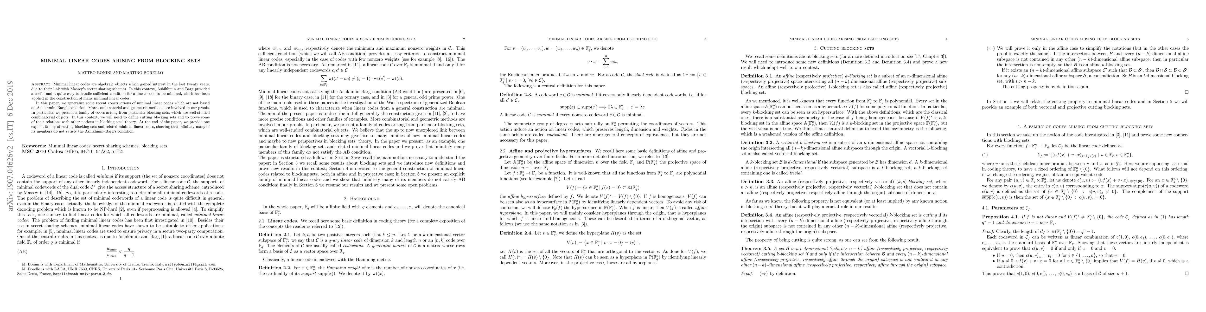 This paper generalizes constructions of minimal linear codes beyond the Ashikhmin-Barg sufficient condition, utilizing combinatorial and geometric methods. It introduces codes derived from specific blocking sets, defining cutting blocking sets and illustrating their unique properties, ultimately presenting an explicit family where many members do not meet the Ashikhmin-Barg criteria.