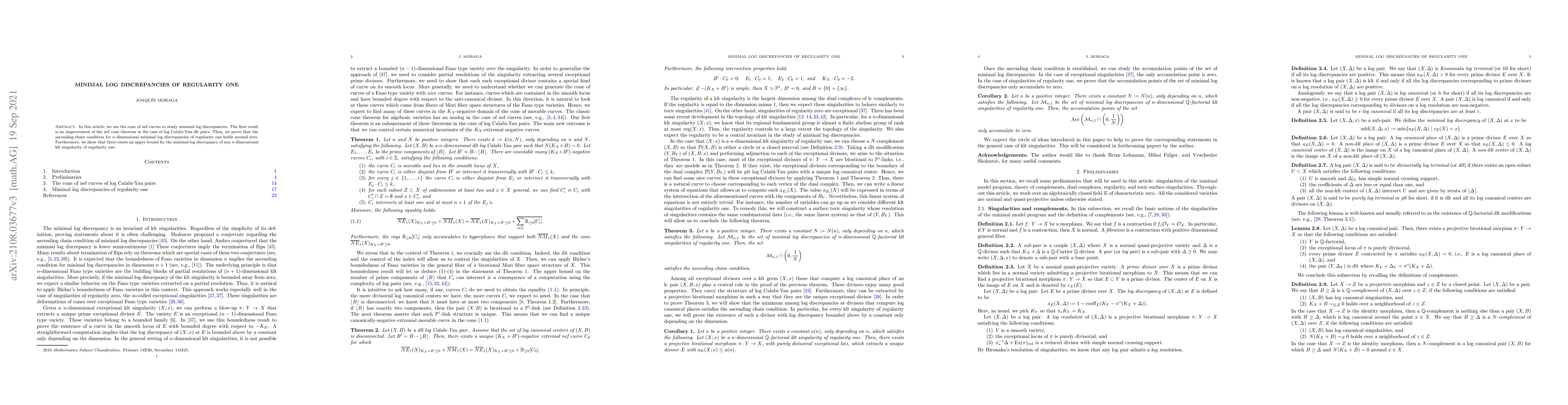 This paper improves the nef cone theorem for log Calabi-Yau dlt pairs and establishes the ascending chain condition for minimal log discrepancies of regularity one, proving an upper bound for such discrepancies in klt singularities.