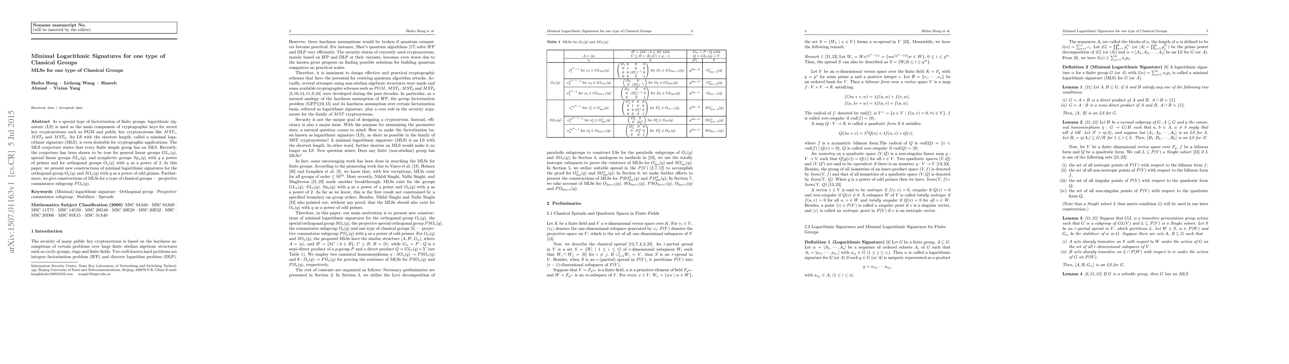 As a special type of factorization of finite groups, logarithmic signature (LS) is used as the main component of cryptographic keys for secret key cryptosystems such as PGM and public key cryptosystems like MST1, MST2 and MST3. An LS with the shortest length, called a minimal logarithmic signature (MLS), is even desirable for cryptographic applications. The MLS conjecture states that every finite simple group has an MLS. Recently, the conjecture has been shown to be true for general linear groups GLn(q), special linear groups SLn(q), and symplectic groups Spn(q) with q a power of primes and for orthogonal groups On(q) with q as a power of 2. In this paper, we present new constructions of minimal logarithmic signatures for the orthogonal group On(q) and SOn(q) with q as a power of odd primes. Furthermore, we give constructions of MLSs for a type of classical groups projective commutator subgroup.