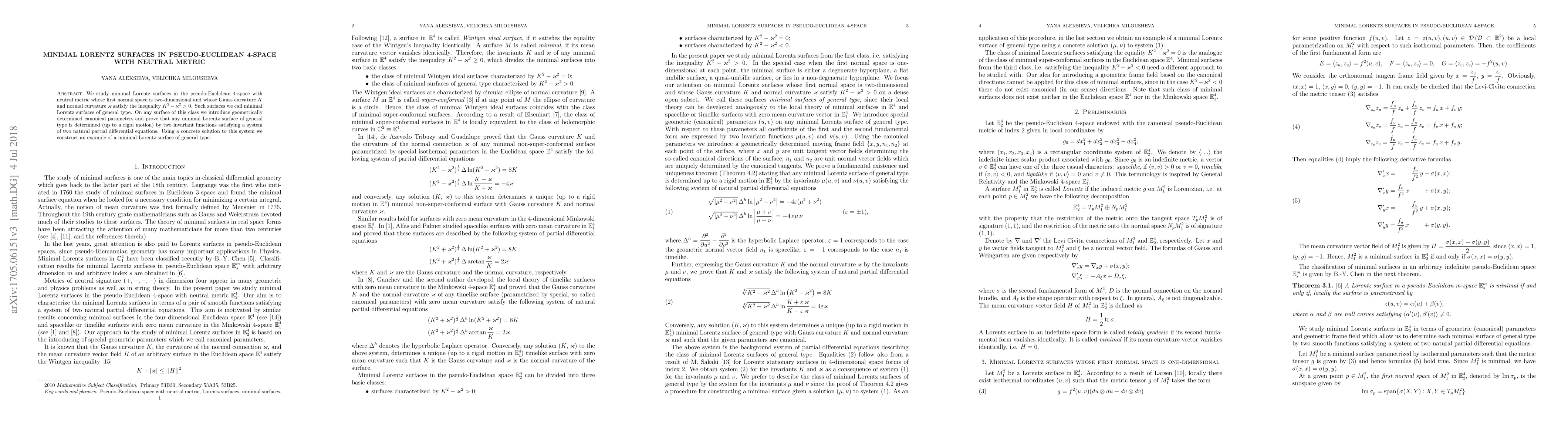 This research explores minimal Lorentz surfaces in pseudo-Euclidean 4-space with a neutral metric, characterized by specific geometric parameters and a system of partial differential equations. It concludes that such surfaces are determined by two invariant functions and provides an example solution.
