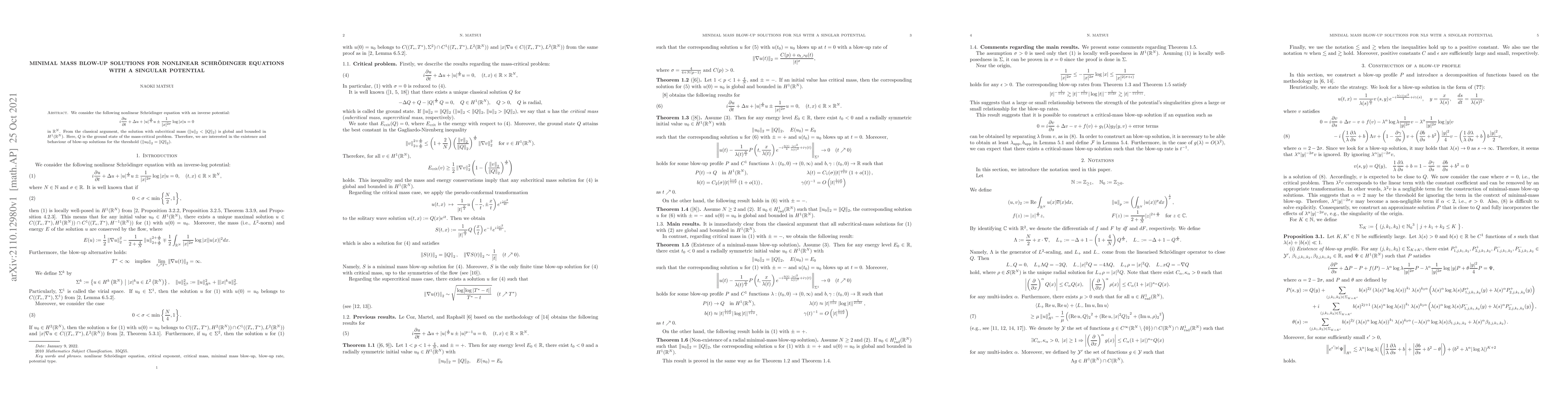 This paper investigates minimal mass blow-up solutions for a nonlinear Schrödinger equation with an inverse potential in \(\mathbb{R}^N\). It focuses on solutions at the critical mass level, examining their existence and behavior as they approach finite time blow-up.