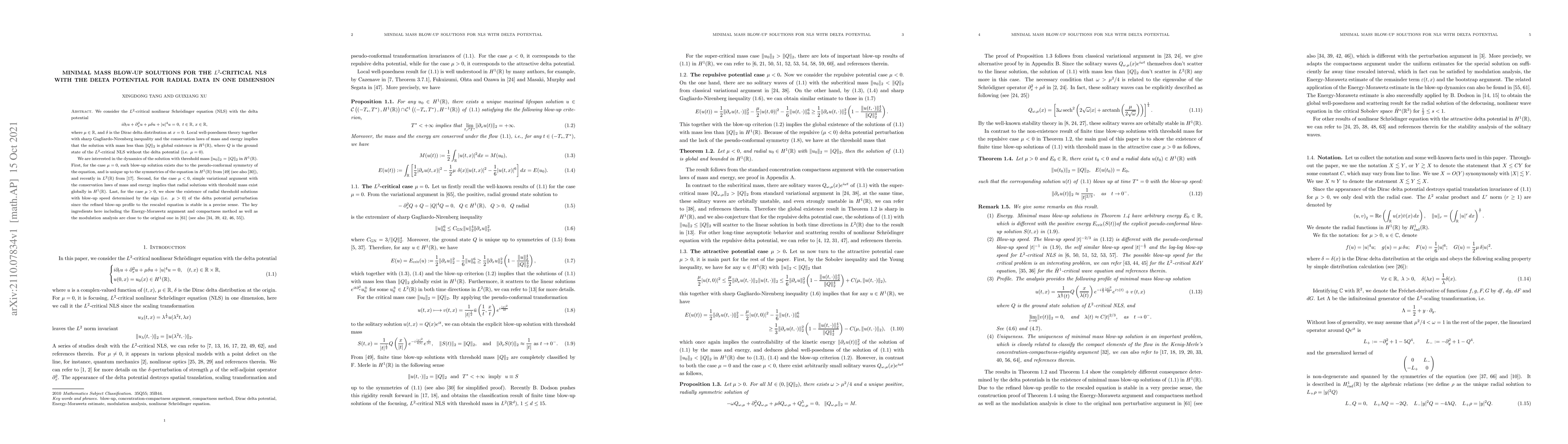 This paper investigates minimal mass blow-up solutions for the $L^2$-critical nonlinear Schrödinger equation with a delta potential in one dimension. It demonstrates the existence of such solutions for different values of the delta potential parameter $\mu$, showing that the blow-up speed is influenced by the sign of $\mu$, and utilizes techniques like the Energy-Morawetz inequality and compactness methods.