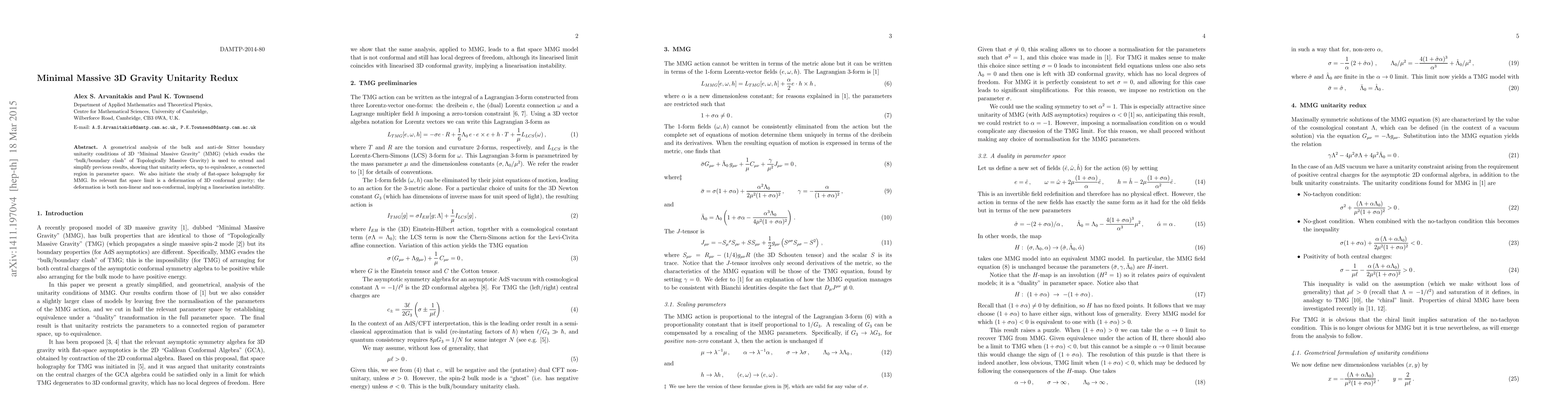 This paper geometrically analyzes the unitarity conditions of 3D "Minimal Massive Gravity" (MMG) to extend previous results, demonstrating that unitarity constrains a specific region in parameter space. It also initiates the study of flat-space holography for MMG, revealing a deformation of 3D conformal gravity that introduces a linearisation instability.