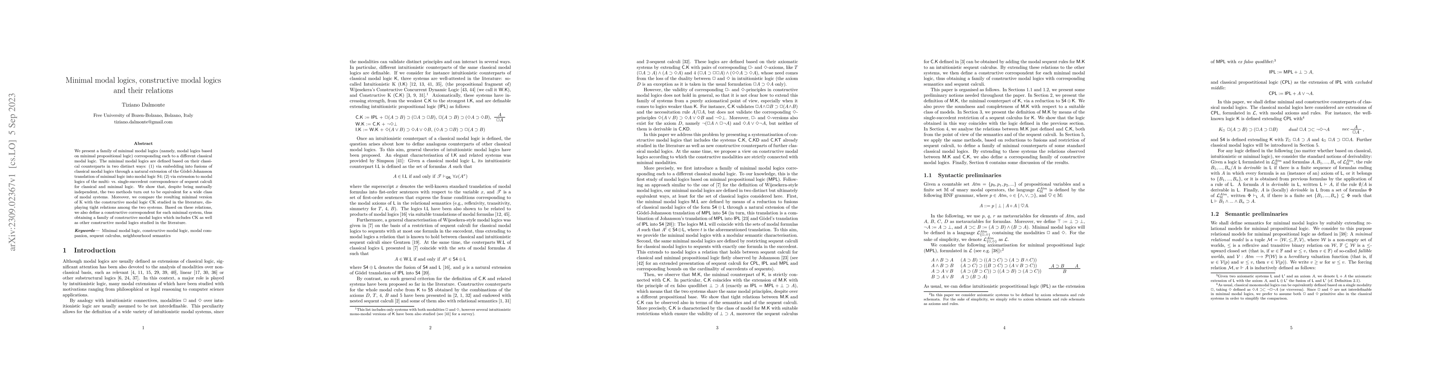 This paper introduces minimal modal logics derived from classical modal logics using two distinct methods, demonstrating their equivalence and relating them to constructive modal logics, including a new family of constructive modal logics encompassing previously studied systems like CK.