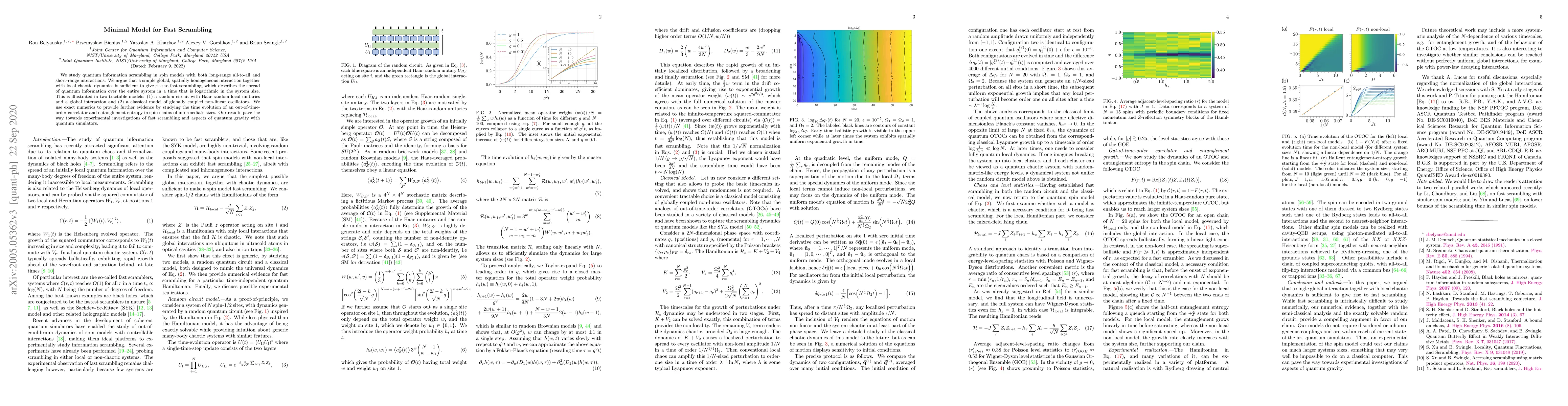 This research explores quantum information scrambling in spin models through simple interactions and local chaotic dynamics, demonstrating that fast scrambling can occur in systems with global, homogeneous interactions. Two models—a random quantum circuit and a classical oscillator system—show logarithmic scrambling times, suggesting potential for experimental study in quantum simulators.