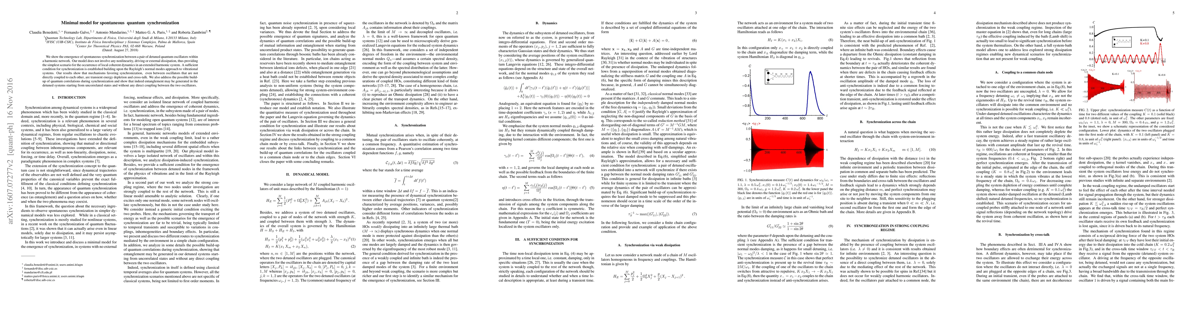 We show the emergence of spontaneous synchronization between a pair of detuned quantum oscillators within a harmonic network. Our model does not involve any nonlinearity, driving, or external dissipation, thus providing the simplest scenario for the occurrence of local coherent dynamics in an extended harmonic system. A sufficient condition for synchronization is established by building upon the Rayleigh normal mode approach to vibrational systems. Our results show that mechanisms favoring synchronization, even between oscillators that are not directly coupled to each other, are transient energy depletion and crosstalk. We also address the possible buildup of quantum correlations during synchronization and show that indeed entanglement may be generated in detuned systems, starting from uncorrelated states and without any direct coupling between the two oscillators.