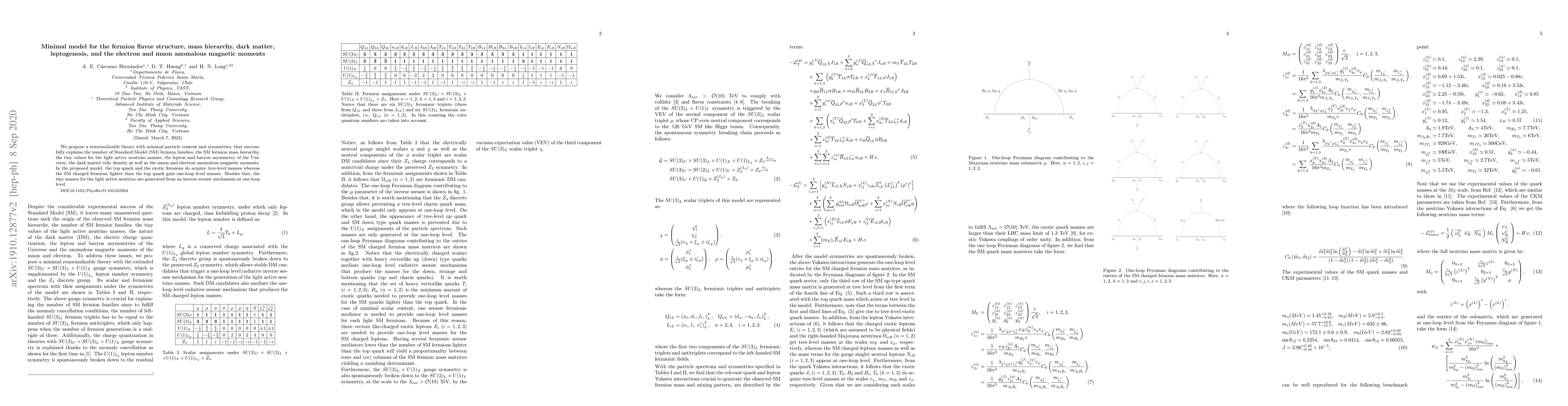 This paper proposes a minimal renormalizable theory with few particles and symmetries to explain the Standard Model fermion families, mass hierarchy, light neutrino masses, dark matter, leptogenesis, and anomalous magnetic moments of the electron and muon, using an inverse seesaw mechanism for neutrinos and one-loop mass generation.
