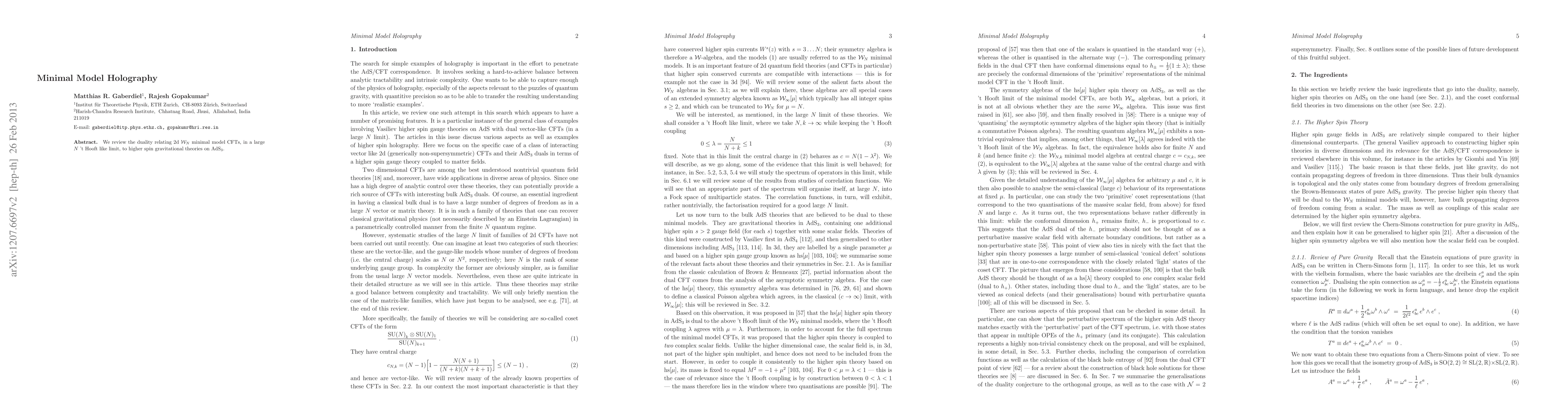 Summary: This paper reviews the duality between 2d W_N minimal model conformal field theories in a large N limit and higher spin gravitational theories in AdS_3, exploring the holographic connection.