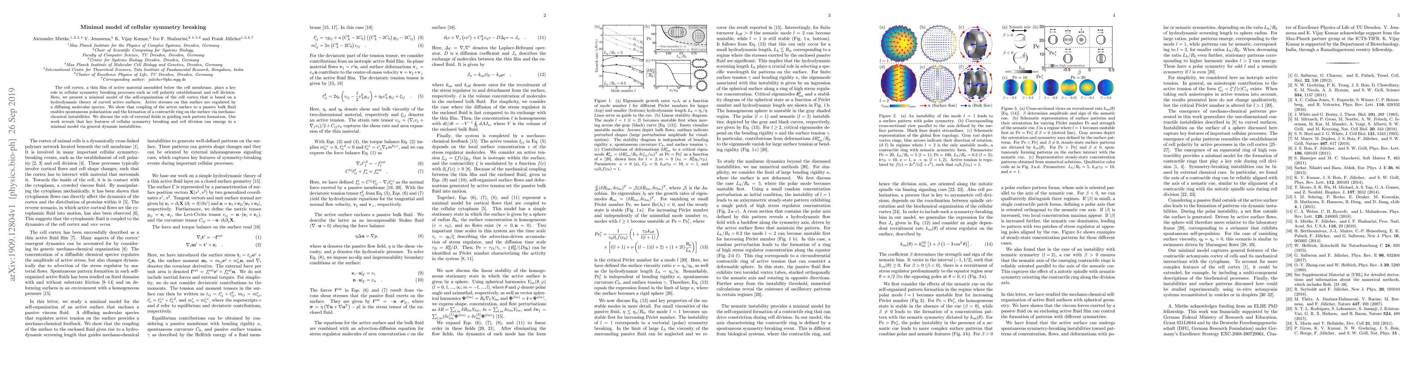 The cell cortex, a thin film of active material assembled below the cell membrane, plays a key role in cellular symmetry breaking processes such as cell polarity establishment and cell division. Here, we present a minimal model of the self-organization of the cell cortex that is based on a hydrodynamic theory of curved active surfaces. Active stresses on this surface are regulated by a diffusing molecular species. We show that coupling of the active surface to a passive bulk fluid enables spontaneous polarization and the formation of a contractile ring on the surface via mechano-chemical instabilities. We discuss the role of external fields in guiding such pattern formation. Our work reveals that key features of cellular symmetry breaking and cell division can emerge in a minimal model via general dynamic instabilities.