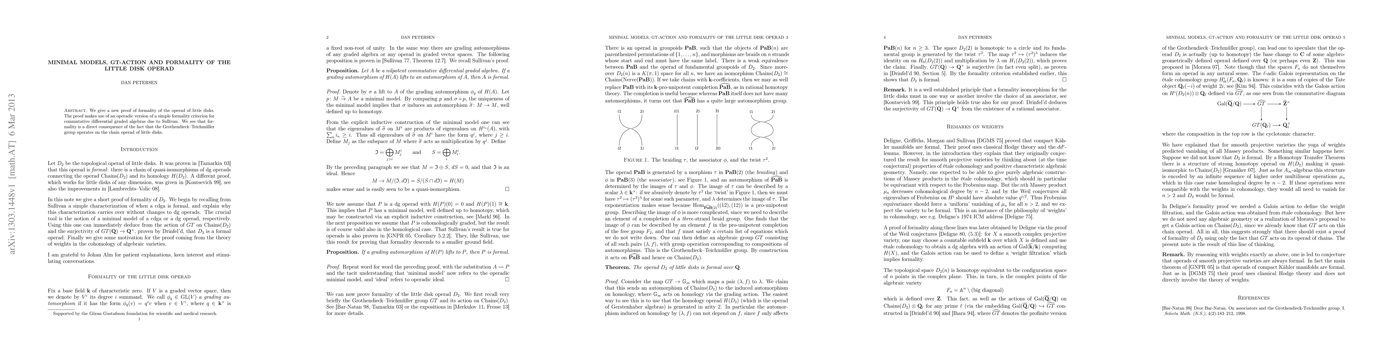 This paper provides a novel proof for the formality of the little disk operad using an operadic adaptation of Sullivan's formality criterion for commutative differential graded algebras, linking it to the action of the Grothendieck-Teichmüller group on the chain operad of little disks.