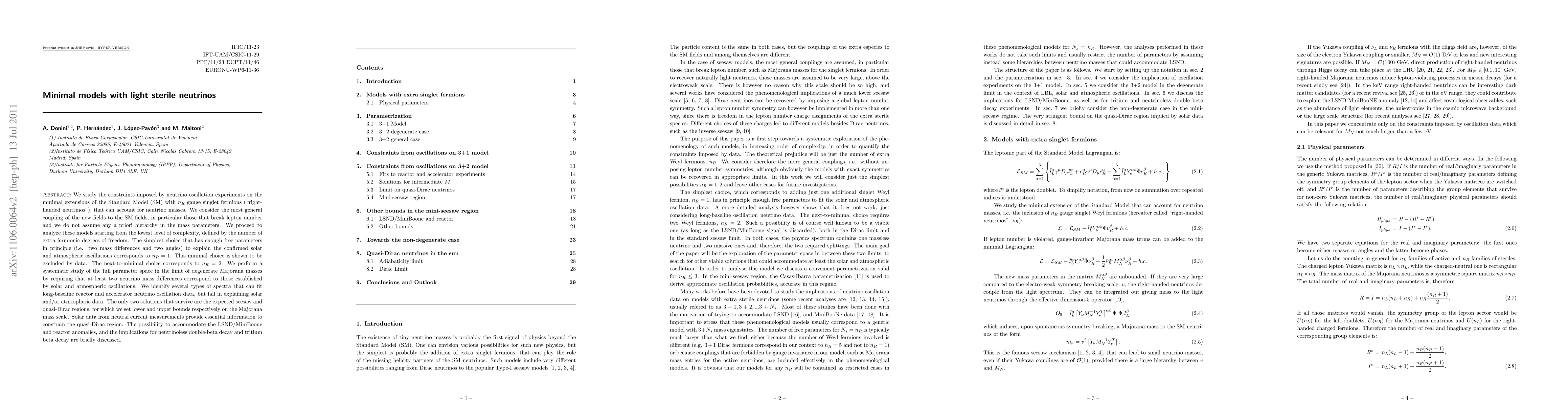We study the constraints imposed by neutrino oscillation experiments on the minimal extensions of the Standard Model (SM) with $n_R$ gauge singlet fermions ("right-handed neutrinos"), that can account for neutrino masses. We consider the most general coupling to SM fields of the new fields, in particular those that break lepton number and we do not assume any a priori hierarchy in the mass parameters. We proceed to analyze these models starting from the lowest level of complexity, defined by the number of extra fermionic degrees of freedom. The simplest choice that has enough free parameters in principle (i.e. two mass differences and two angles) to explain the confirmed solar and atmospheric oscillations corresponds to $n_R=1$. This minimal choice is shown to be excluded by data. The next-to-minimal choice corresponds to $n_R=2$. We perform a systematic study of the full parameter space in the limit of degenerate Majorana masses by requiring that at least two neutrino mass differences correspond to those established by solar and atmospheric oscillations. We identify several types of spectra that can fit long-baseline reactor and accelerator neutrino oscillation data, but fail in explaining solar and/or atmospheric data. The only two solutions that survive are the expected seesaw and quasi-Dirac regions, for which we set lower and upper bounds respectively on the Majorana mass scale. Solar data from neutral current measurements provide essential information to constrain the quasi-Dirac region. The possibility to accommodate the LSND/MiniBoone and reactor anomalies, and the implications for neutrinoless double-beta decay and tritium beta decay are briefly discussed.