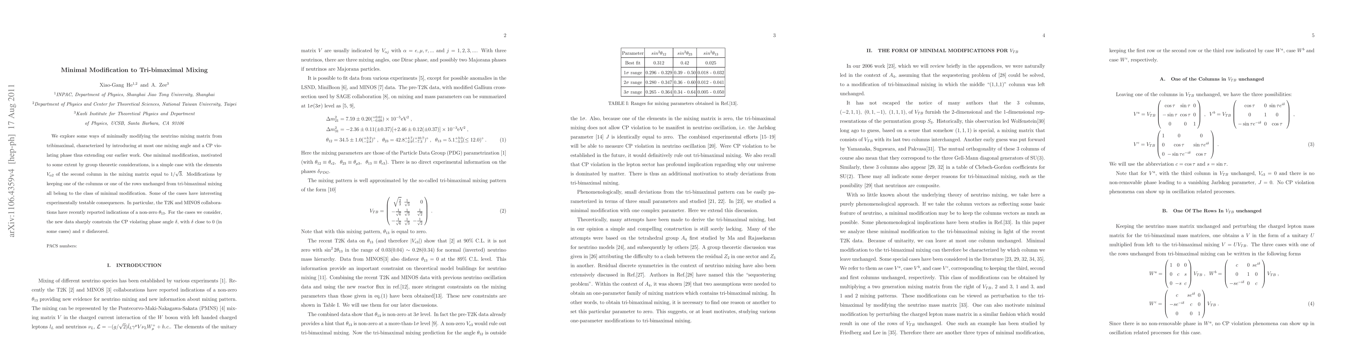 We explore some ways of minimally modifying the neutrino mixing matrix from tribimaximal, characterized by introducing at most one mixing angle and a CP violating phase thus extending our earlier work. One minimal modification, motivated to some extent by group theoretic considerations, is a simple case with the elements $V_{\alpha 2}$ of the second column in the mixing matrix equal to $1/\sqrt{3}$. Modifications by keeping one of the columns or one of the rows unchanged from tri-bimaximal mixing all belong to the class of minimal modification. Some of the cases have interesting experimentally testable consequences. In particular, the T2K and MINOS collaborations have recently reported indications of a non-zero $\theta_{13}$. For the cases we consider, the new data sharply constrain the CP violating phase angle $\delta$, with $\delta$ close to 0 (in some cases) and $\pi$ disfavored.