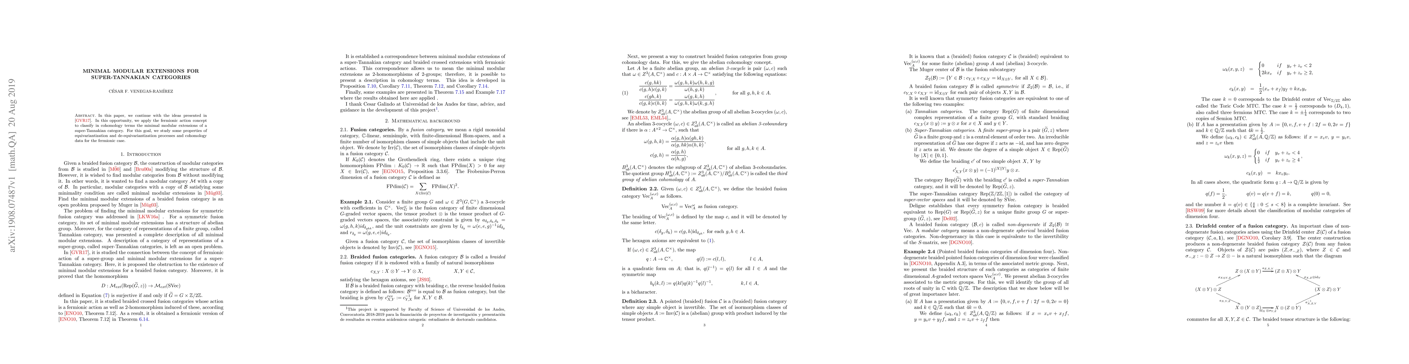 This paper classifies minimal modular extensions of super-Tannakian categories using the fermionic action concept, focusing on the properties of equivariantization and de-equivariantization processes and their associated cohomology data.