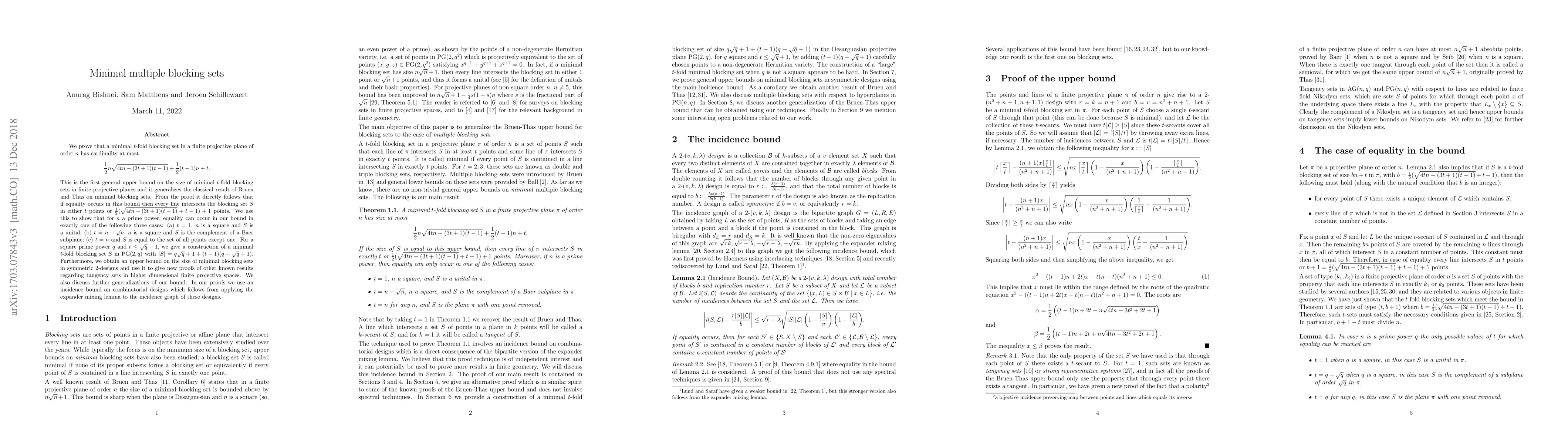 The paper establishes a new upper bound for the size of minimal $t$-fold blocking sets in finite projective planes and explores cases where equality occurs. It also constructs specific blocking sets for prime power orders and applies the results to symmetric $2$-designs and higher dimensional projective spaces.