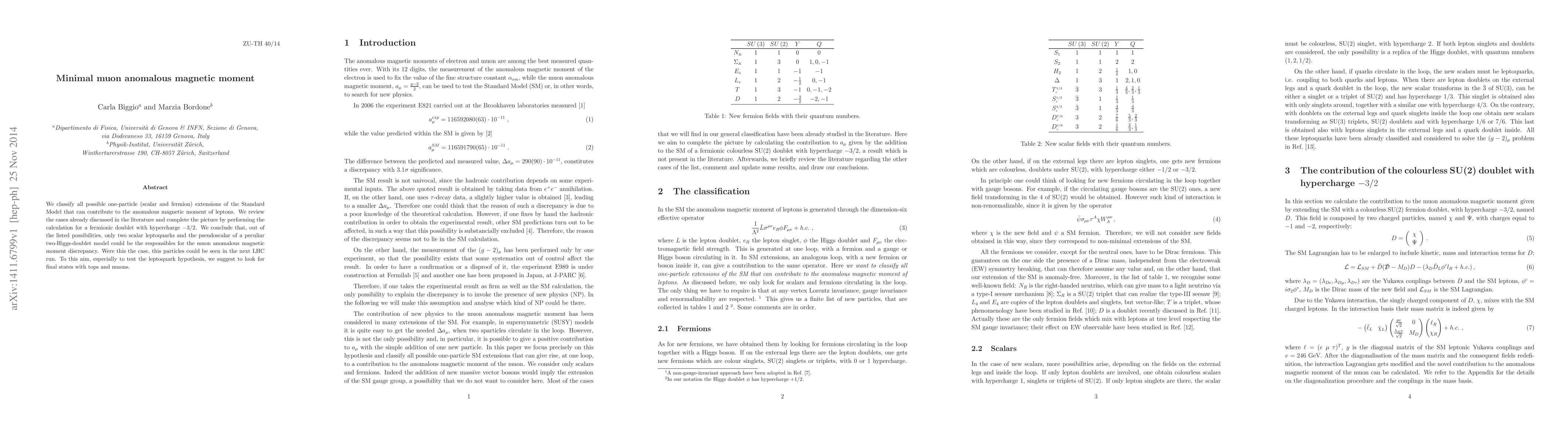 The paper presents detailed calculations for the anomalous magnetic moment contributions from various one-particle extensions of the Standard Model, including a fermionic doublet with hypercharge -3/2, and identifies viable candidates for explaining the muon anomaly.