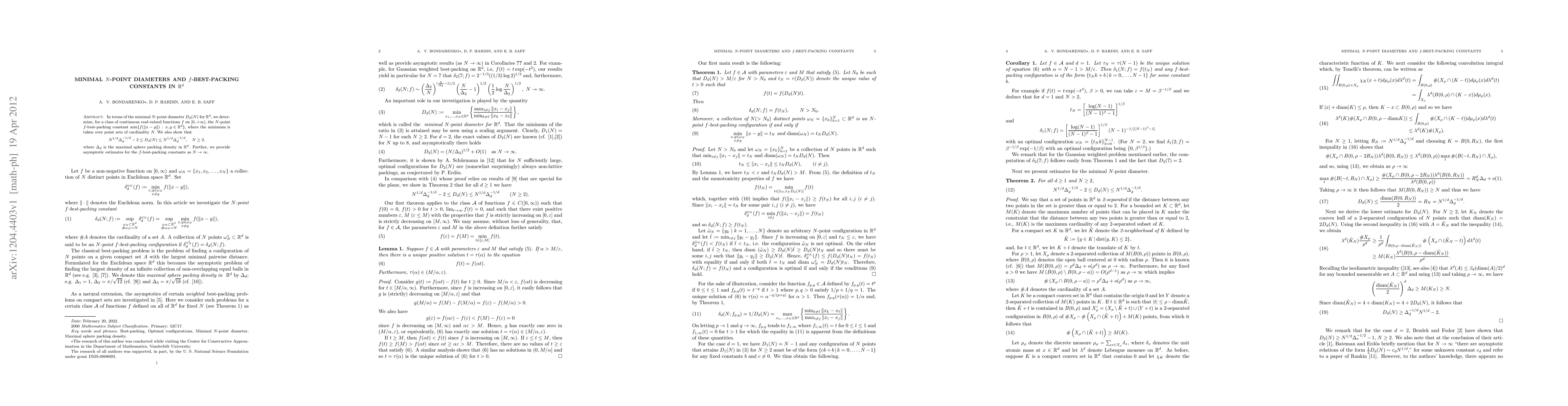 In terms of the minimal $N$-point diameter $D_d(N)$ for $R^d,$ we determine, for a class of continuous real-valued functions $f$ on $[0,+\infty],$ the $N$-point $f$-best-packing constant $\min\{f(\|x-y\|)\, :\, x,y\in \R^d\}$, where the minimum is taken over point sets of cardinality $N.$ We also show that $$ N^{1/d}\Delta_d^{-1/d}-2\le D_d(N)\le N^{1/d}\Delta_d^{-1/d}, \quad N\ge 2,$$ where $\Delta_d$ is the maximal sphere packing density in $\R^d$. Further, we provide asymptotic estimates for the $f$-best-packing constants as $N\to\infty$.